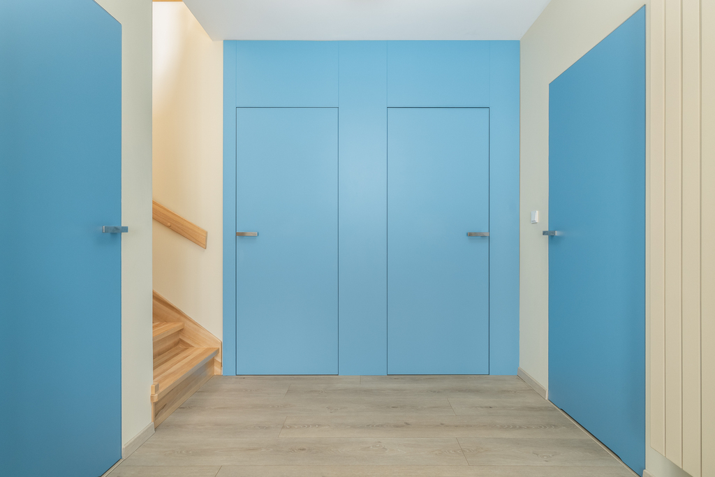 - w korytarzu i na piętrze zabudowane schowki