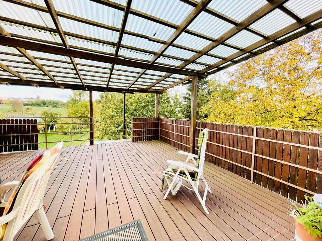• salon z wyjściem na duży taras, z widokiem na pięknie zagospodarowaną działkę
