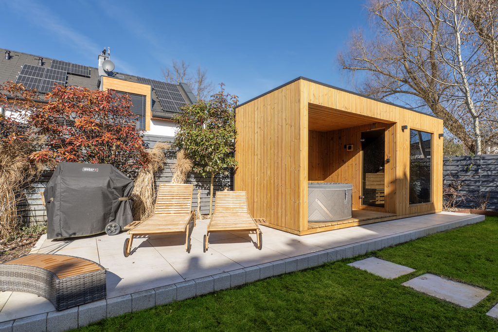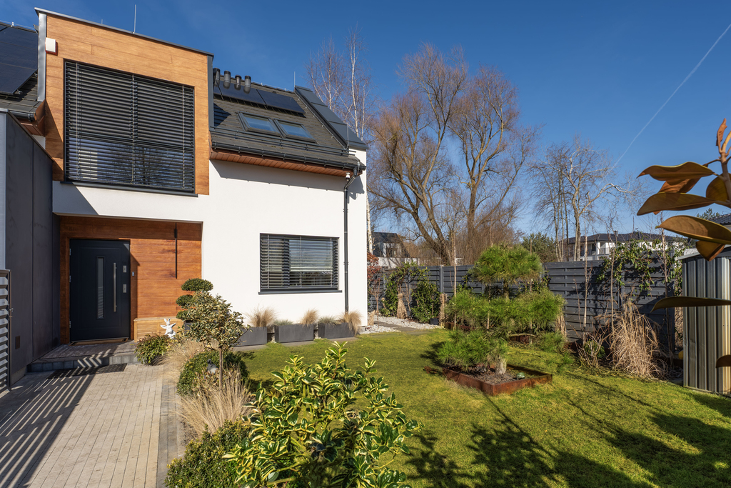 W ogrodzie znajduje się prywatna strefa wypoczynkowa z zewnętrzną sauną oraz jacuzzi ? doskonałe miejsce do odprężenia po intensywnym dniu. Ogród został starannie zagospodarowany, zapewniając prywatność i komfort użytkowania.