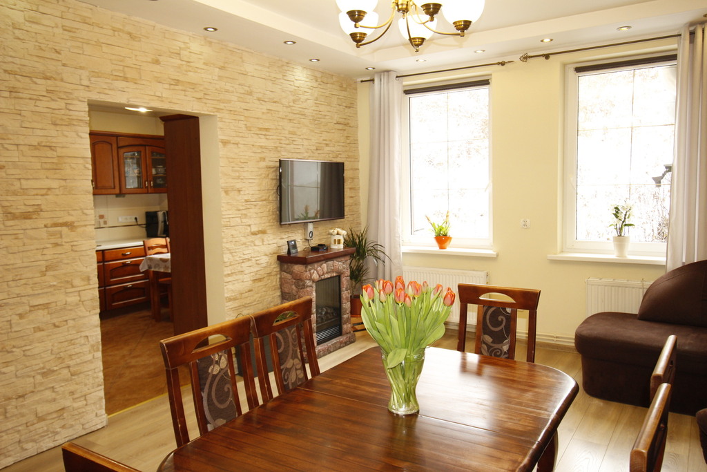 Mieszkanie przeszło gruntowną modernizację, co zapewnia bezpieczeństwo i oszczędność: została wymieniona instalacja elektryczna i hydrauliczna, a także zamontowano eleganckie, duże okna PVC i nową stolarkę drzwiową (wewnętrzną i zewnętrzną). Sufity obniżone, co optycznie ociepla wnętrza i zmniejsza koszty ogrzewania. W pokojach wysokiej jakości panele. W holu, kuchni i łazience estetyczne płytki. Własny piec na drewno i węgiel z kwasoodpornym wkładem kominowym zapewnia niskie koszty ogrzewania w zimie. Ciepłą wodę zapewnia pojemny, ocieplony bojler 150l.