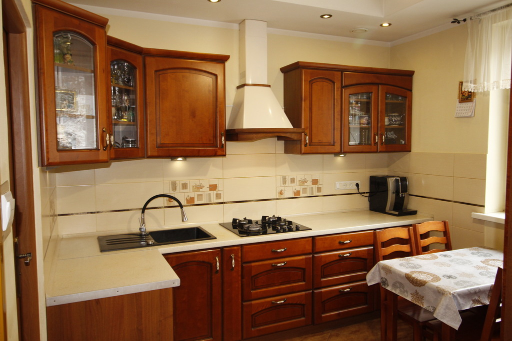 - kuchnia - wyposażona w solidne, stylowe drewniane meble oraz sprzęt AGD: lodówkę, kuchenkę gazową i piekarnik elektryczny;