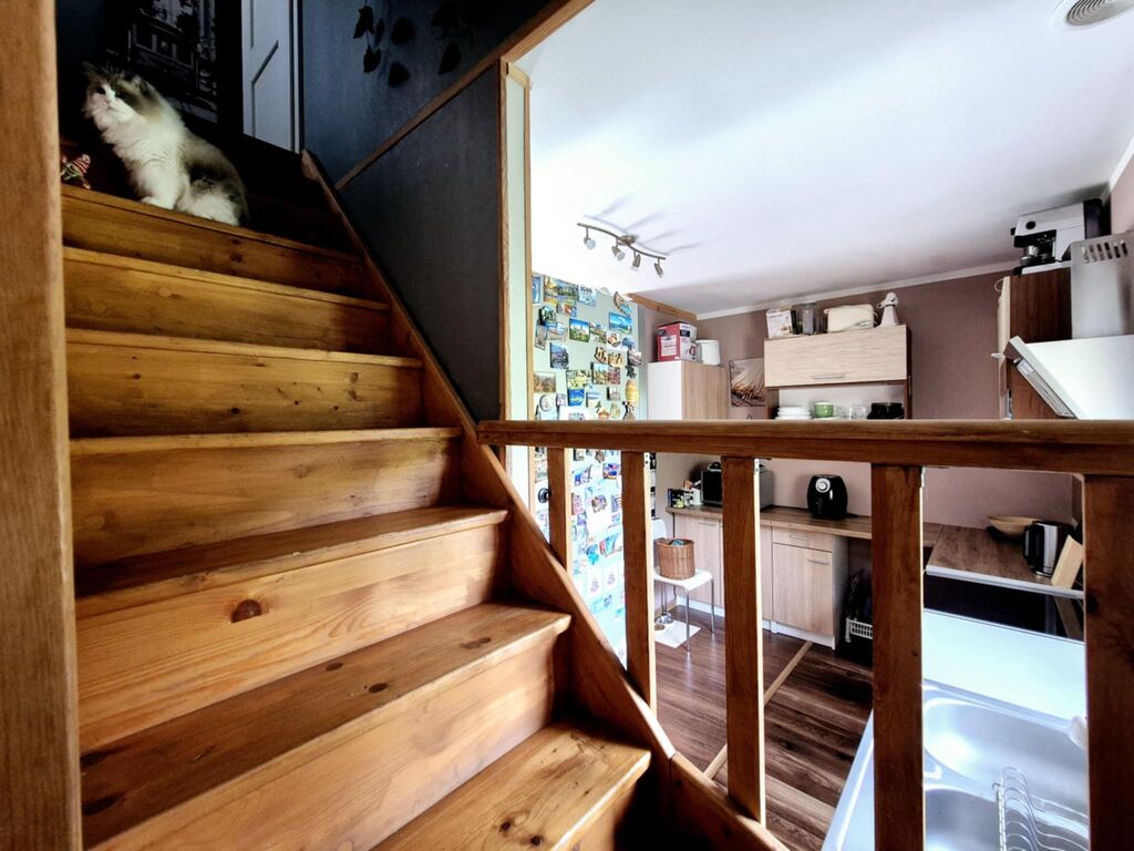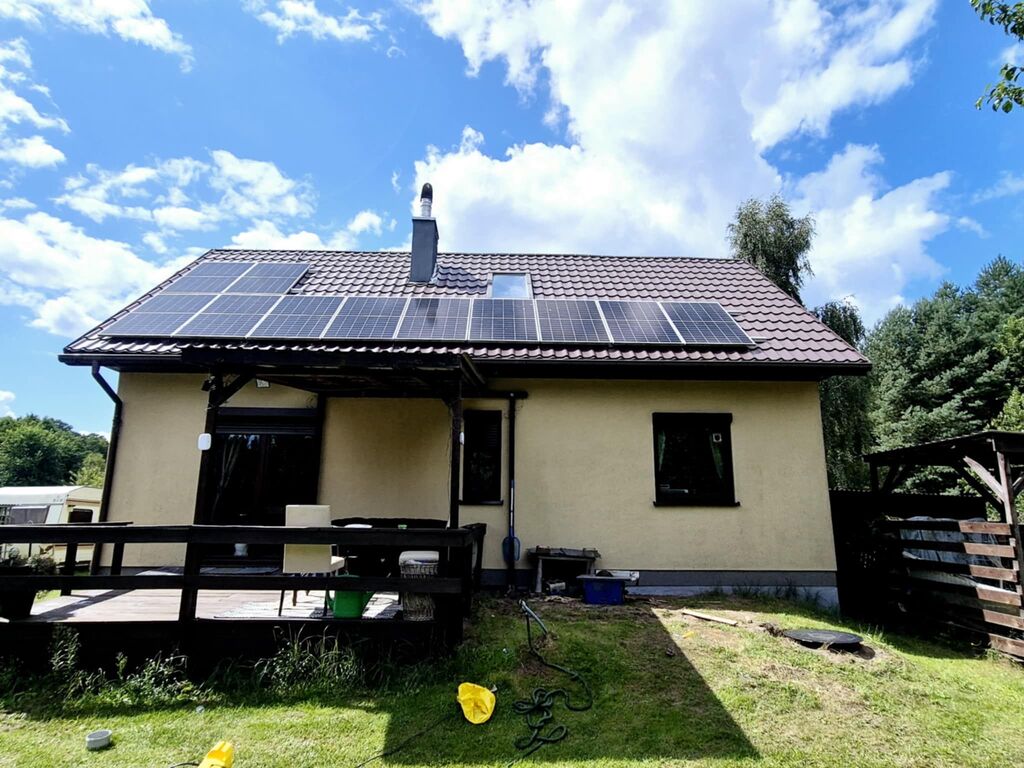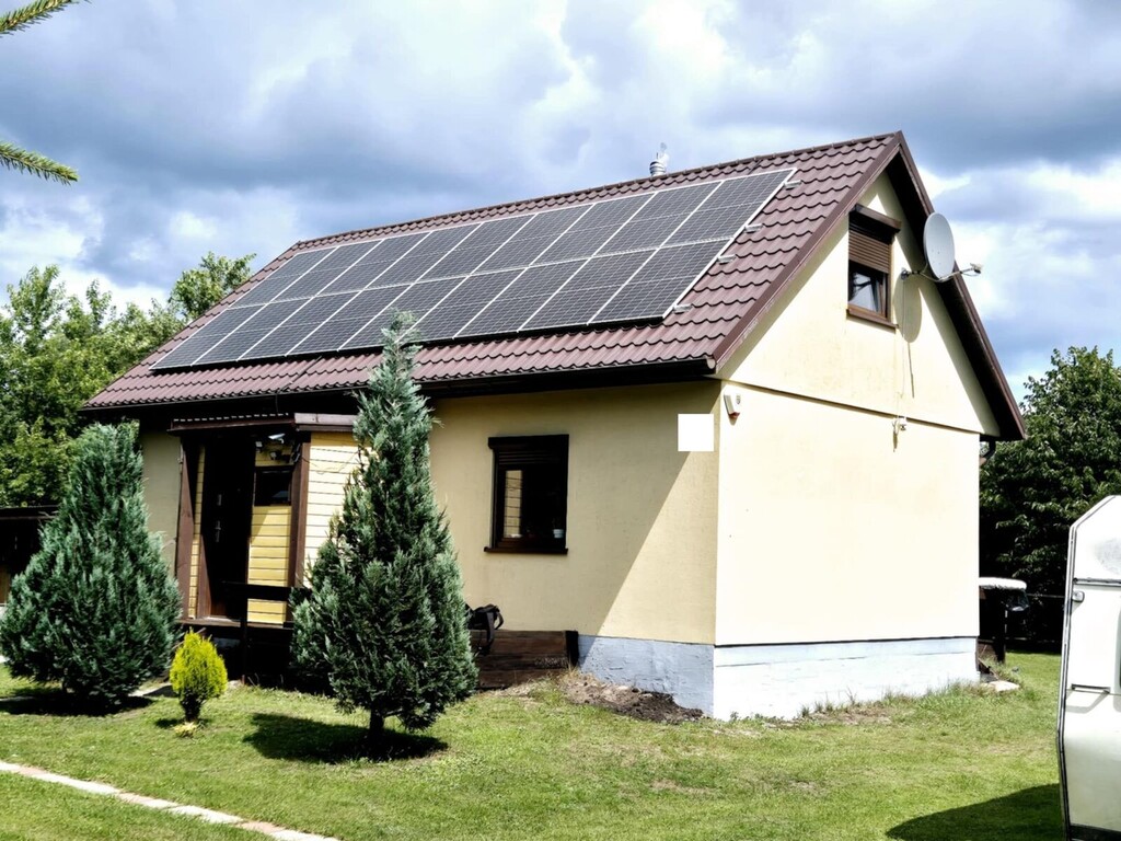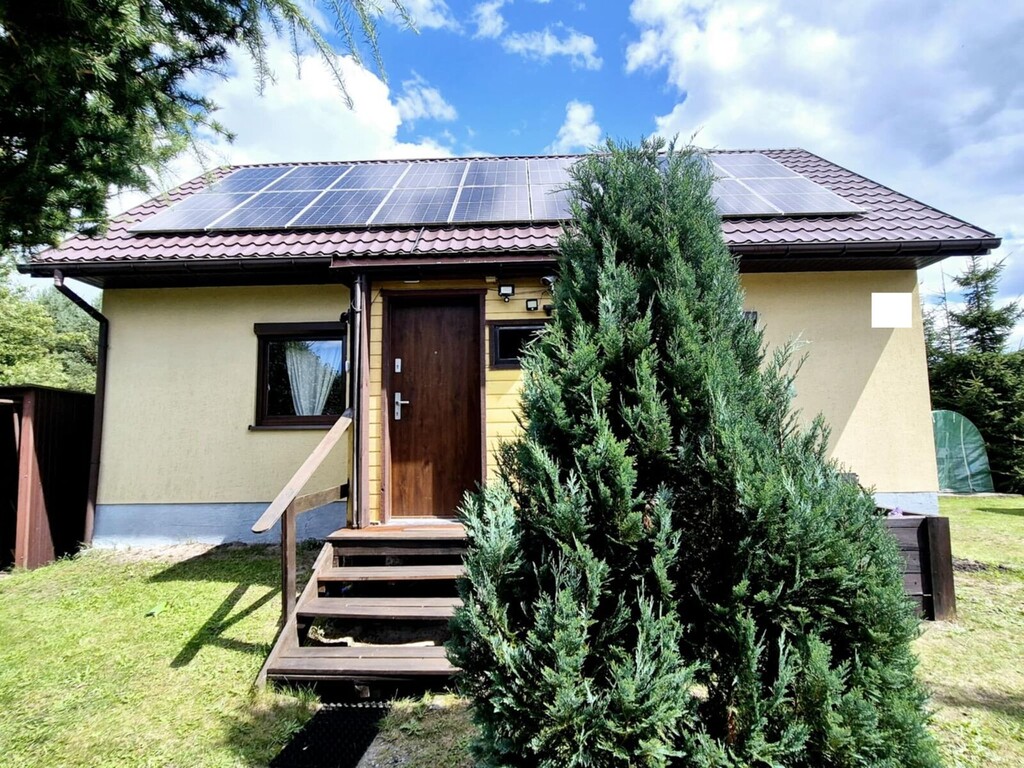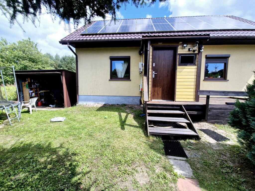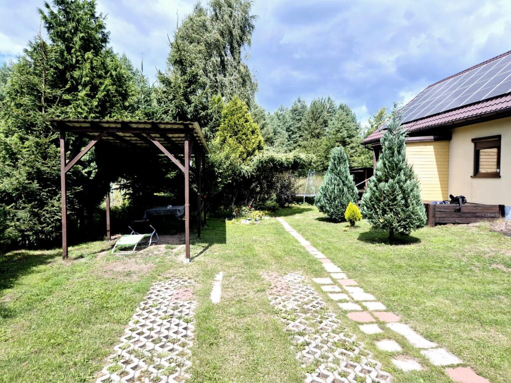 Oferujemy na sprzedaż wolnostojący dom jednorodzinny wybudowany w 2014 roku, posadowiony na zadbanej działce o powierzchni 1156 m?. Nieruchomość znajduje się w spokojnej, zielonej okolicy, w sąsiedztwie lasów i terenów rekreacyjnych.Dom został wykonany w technologii szkieletowej, z bardzo dobrą izolacją termiczną (25 cm ? wełna + styropian). Budynek osadzony jest na solidnej ławie fundamentowej, a dach pokryty blachodachówką został wyposażony w panele fotowoltaiczne rozmieszczone po obu stronach dachu, co znacząco wpływa na niskie koszty utrzymania.