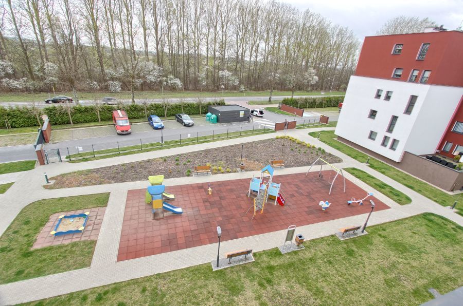 Na terenie ogrodzonego osiedla dostępny jest duży plac zabaw i profesjonale boisko do gry.