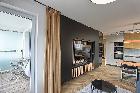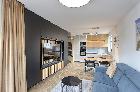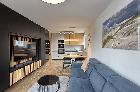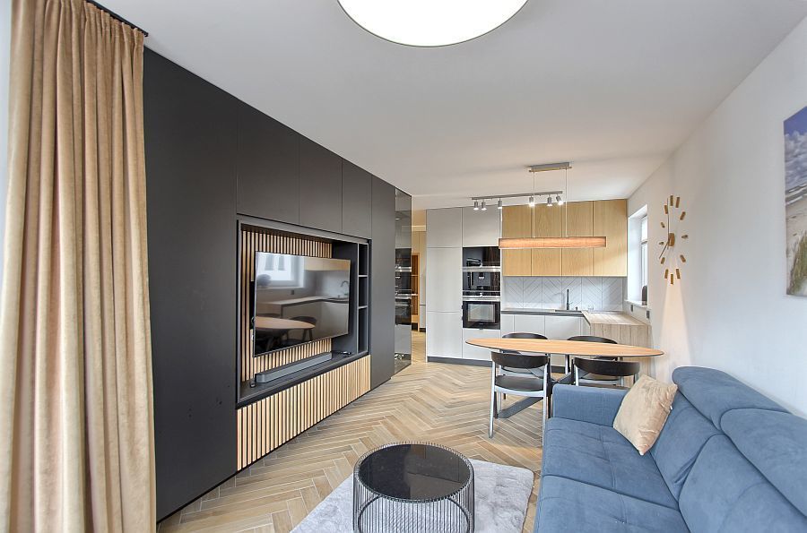 1. W pełni umeblowany salon z aneksem kuchennym oraz wyjściem na balkon.