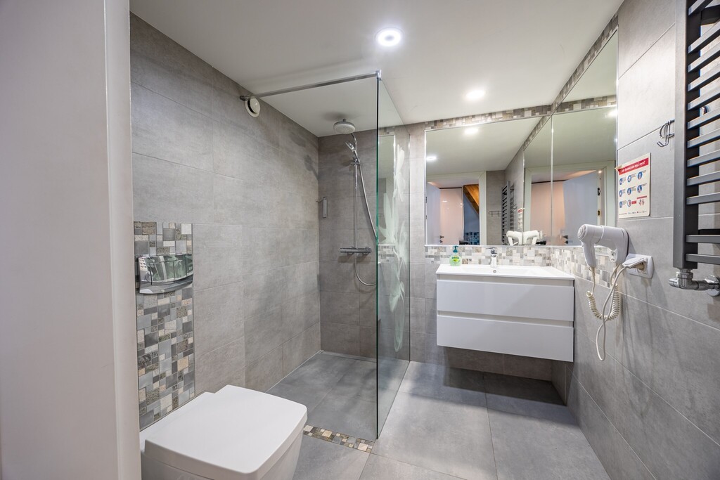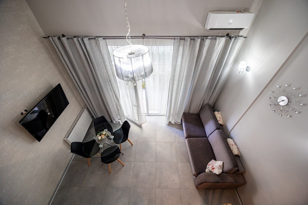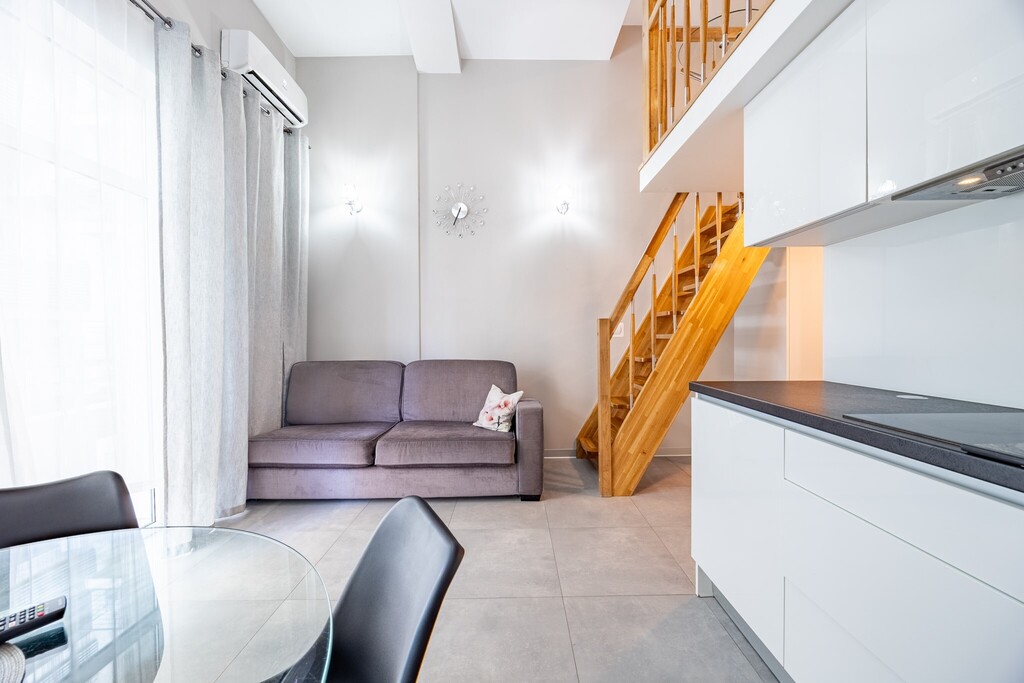 Na dole znajduje się rozkładana kanapa dla dwóch osób, a na antresoli wygodne łóżko ? apartament może komfortowo pomieścić 4 osoby. Z dużego balkonu rozciąga się boczny widok na morze ? idealne miejsce na poranną kawę.