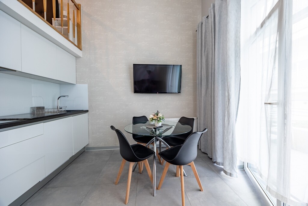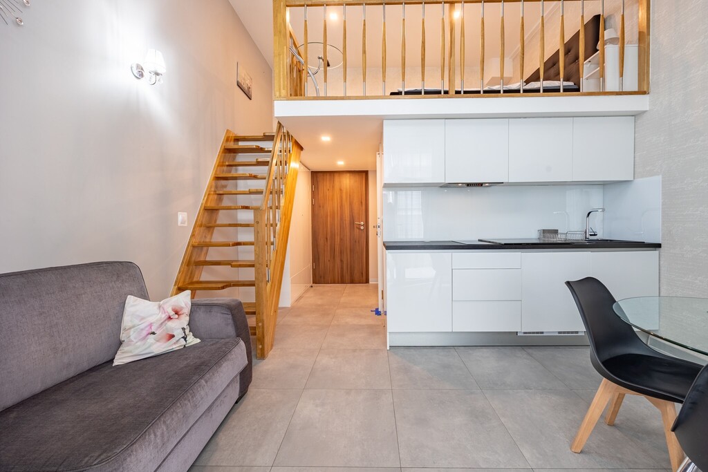 Lokal składa się z pokoju dziennego z aneksem kuchennym oraz łazienki. Dodatkowym atutem jest antresola o wysokości ok. 1,7 m ? to pełnowartościowa przestrzeń sypialniana, która nie jest wliczona do powierzchni użytkowej, dzięki czemu apartament oferuje znacznie więcej miejsca niż wskazuje metraż.