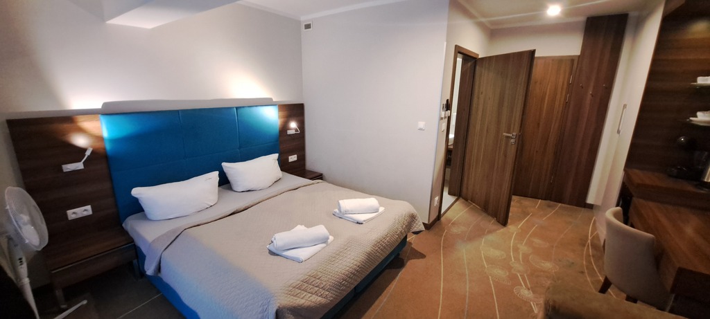 - pokój z podwójnym łóżkiem, szafą garderobianą oraz wygodnym miejscem do siedzenia z ekspresem do kawy,