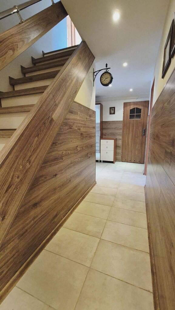 Drewniane schody prowadzą na piętro, nadając wnętrzu ciepły i elegancki charakter.