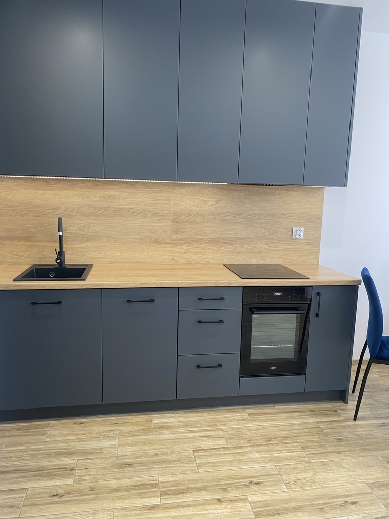 • zabudowa kuchenna w modnej kolorystyce grafit + drewno