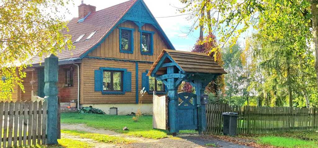 Dom wyróżnia się przepiękną, drewnianą elewacją z niebieskimi okiennicami i detalami, które nadają mu niepowtarzalnego, bajkowego uroku.
