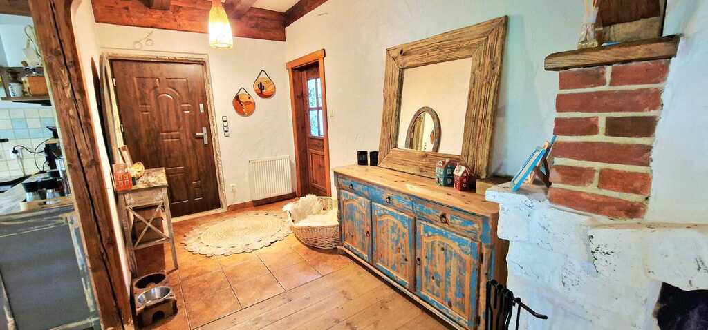 Naturalne, drewniane podłogi i rustykalne wykończenia tworzą atmosferę ciepła i autentyczności.