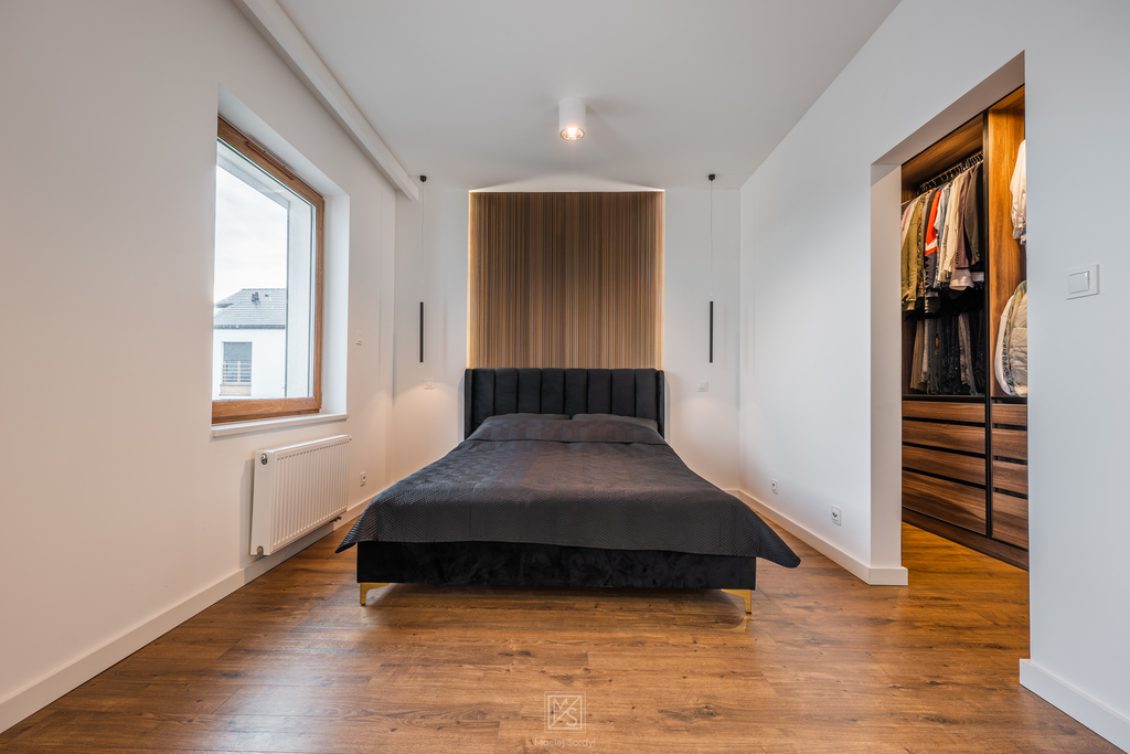 - dużą sypialnię z garderobą (możliwość postawienia ściany i stworzenia dwóch pokoi - tak było pierwotnie)