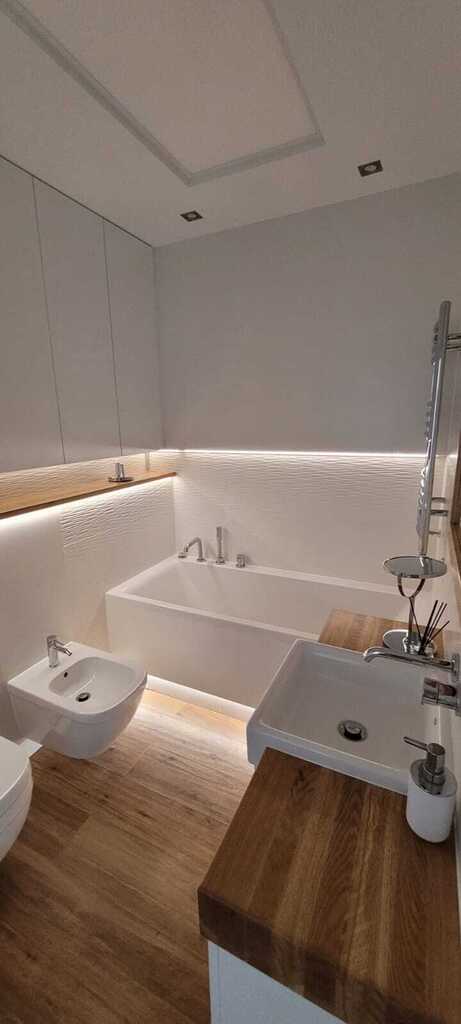 - łazienkę z wanną, prysznicem oraz toaletą i bidetem