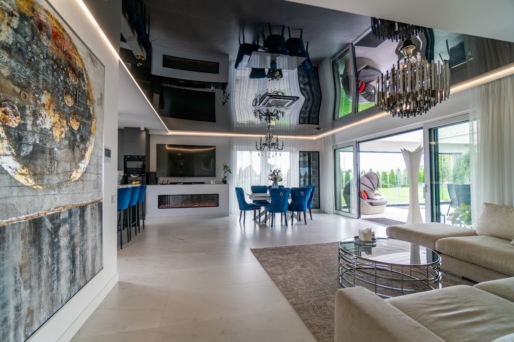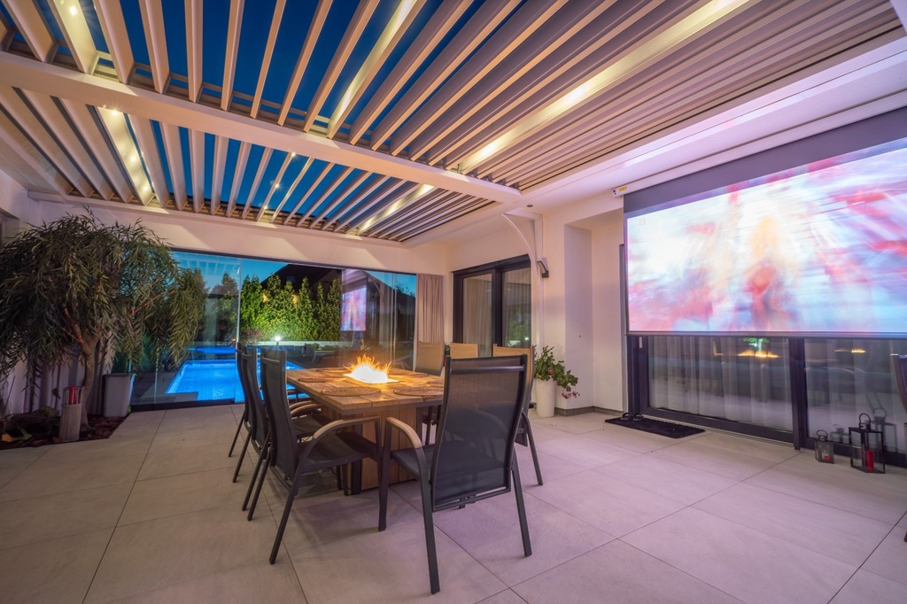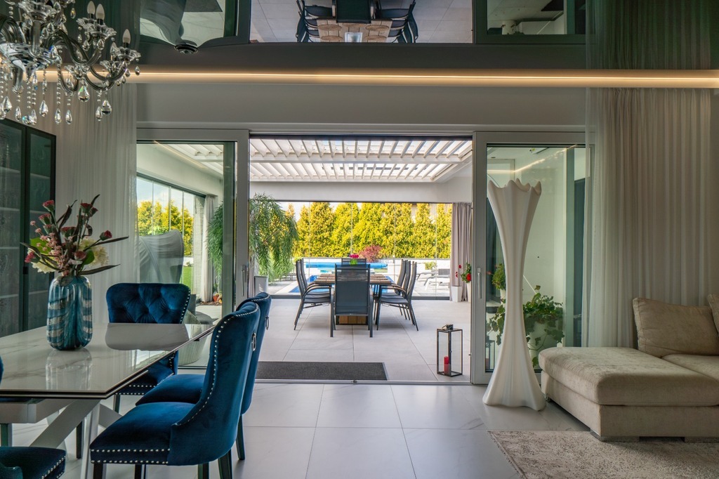 - Taras: o powierzchni 84 m?, wyposażony w uchylny dach regulowany w 3 płaszczyznach oraz ściany z rozsuwanego szkła hartowanego