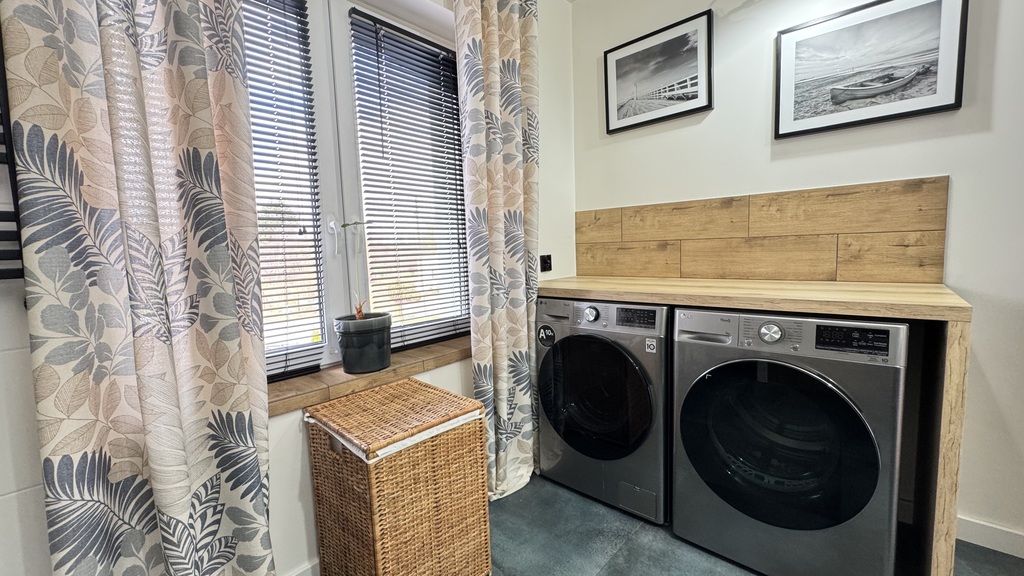 Zadaszona weranda to jeden z największych atutów tego domu ? obszerna, w pełni zadaszona drewnianą konstrukcją, dostępna bezpośrednio z salonu przez przeszklone drzwi. Miejsce stworzone do życia na zewnątrz: meble ogrodowe zapraszają do relaksu, nastrojowe oświetlenie działa przez cały wieczór, a dach chroni przed deszczem niezależnie od pogody. Tu przy kawie można obserwować jezioro, a przy kolacji ? zachód słońca. Taras płynnie łączy wnętrze domu z ogrodem i sprawia, że sezon "na zewnątrz" trwa tu znacznie dłużej niż gdziekolwiek indziej.