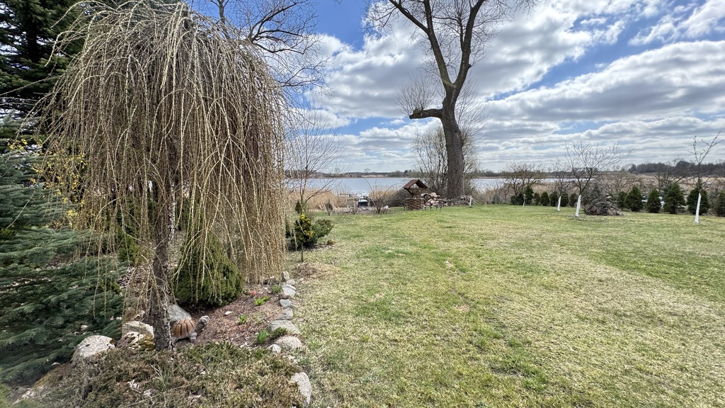Rozległa, zadbana działka schodzi bezpośrednio ku brzegowi jeziora Szadzko. Własne zejście do wody, pomost, miejsce na kajak lub łódkę ? tu wakacje trwają przez całe lato. Płaczące brzozy, stare drzewa, studnia ozdobna i alejki z kamienia tworzą ogród jak z bajki. Dopełnieniem jest wiata garażowa na dwa samochody.