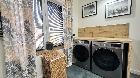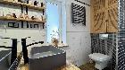 Na piętrze czekają sypialnie z drewnianymi sufitami i skosami nadającymi im przytulny, skandynawski klimat. Każdy pokój wyposażony w szafy pod zabudowę, a na korytarzu dodatkowa zabudowa garderobiana ? przestrzeń do przechowywania przemyślana do ostatniego centymetra. Łazienka na piętrze zachwyca granatową szafką z umywalką, wanną obudowaną płytkami drewnopodobnymi? projekt z wizją. Tu też znajdziemy pralkę i suszarkę, wbudowane w przestrzeń łazienki.