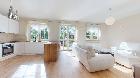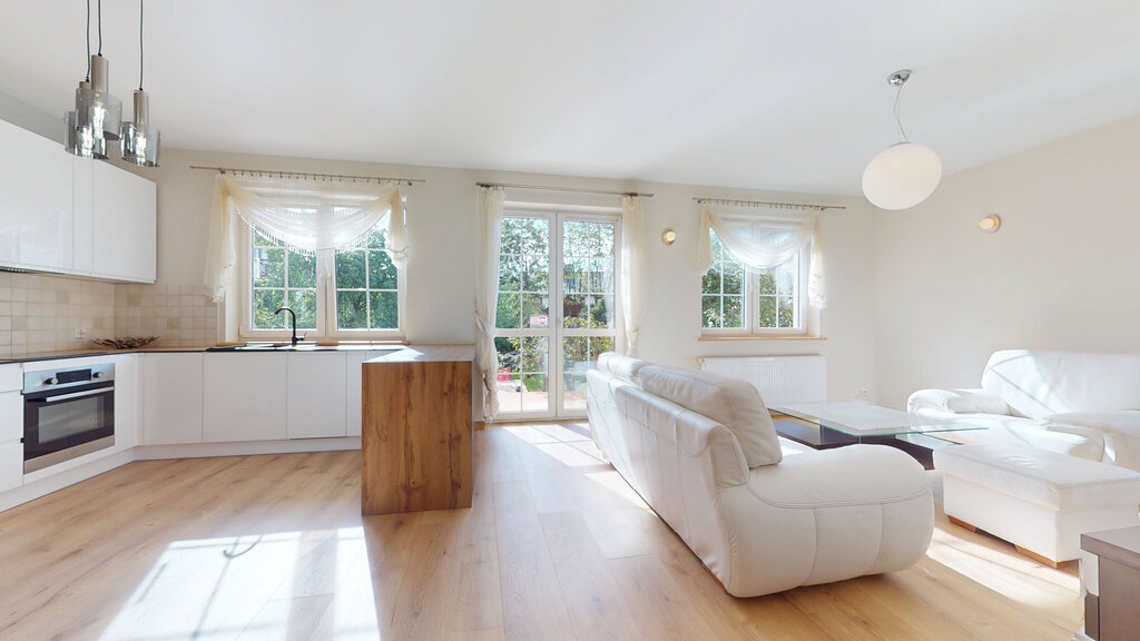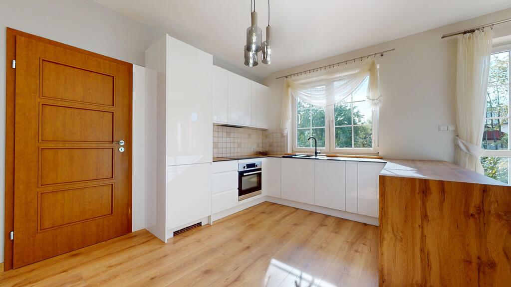 Wnętrze domu utrzymane w jasnych kolorach: biel, szarość, beż. Duża kuchnia zabudowana nowymi meblami na wymiar ze sprzętem AGD. Dwie łazienki: odpowiednio z prysznicem lub wanną.