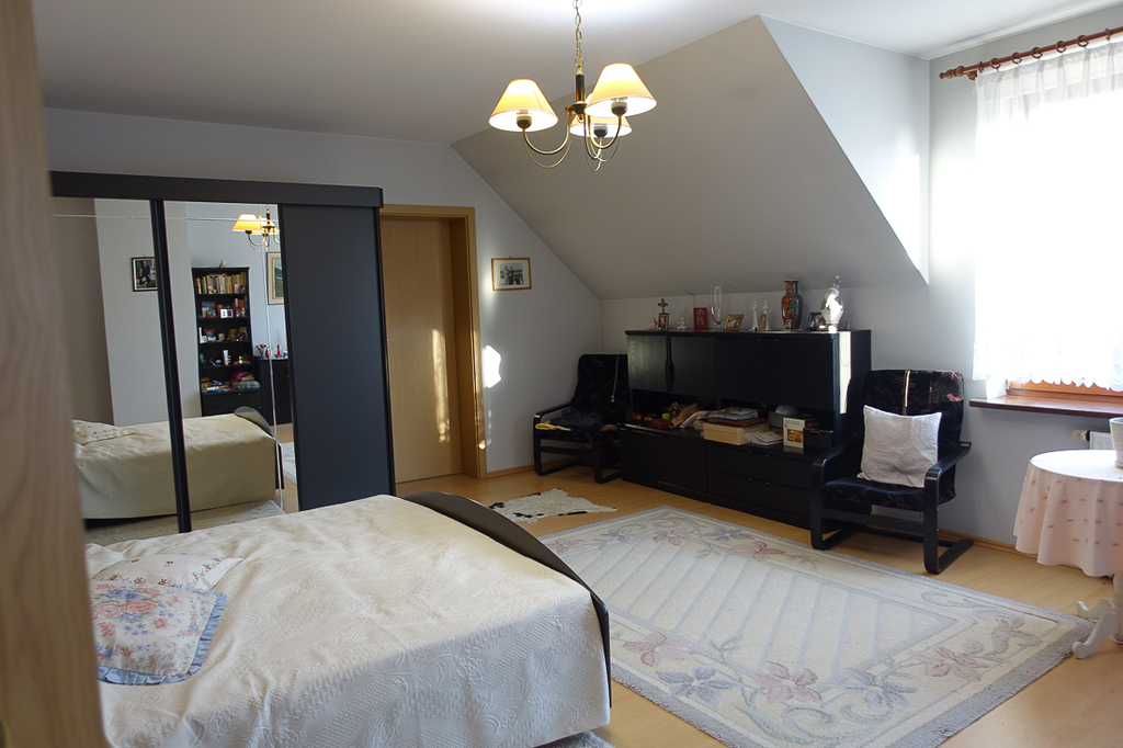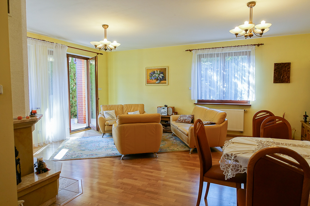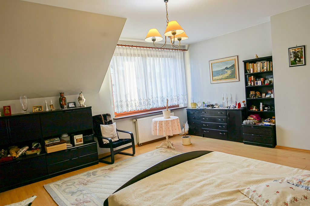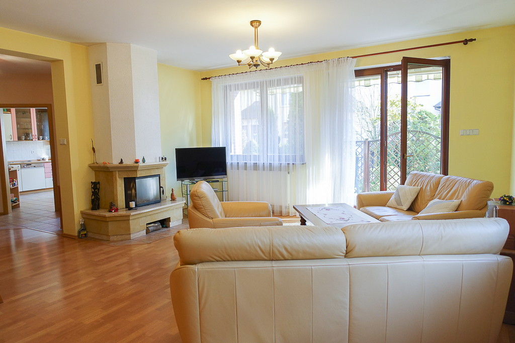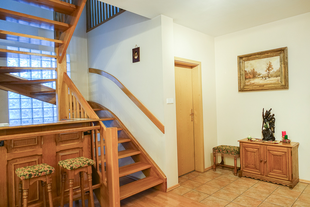 Do sprzedaży wolno stojący dom, z 2000 roku, bardzo wygodny i funkcjonalny. Kameralna lokalizacja na Gumieńcach, przy bardzo spokojnej ulicy, wśród bogatej zieleni i w otoczeniu innych domów jednorodzinnych oraz zielonych terenów rekreacyjnych. Okolice ulic Huzarów, Niepołomickiej, Tynieckiej.Dom z dobrym dostępem do komunikacji miejskiej. Idealny dla wielopokoleniowej rodziny.Wejście do budynku i wjazd do garażu z poziomu zerowego. Poddasze nieużytkowe, dom niepodpiwniczony.Powierzchnia użytkowa 189,5 m?, powierzchnia całkowita 250 m?.Dom położony na działce o powierzchni 492 m?.Parter (93,5 m?)Hall (10,5 m?) - otwarty na salon, z wejściami do: kuchni, toalety dla gości, pomieszczeń technicznych oraz na poddasze.Salon (32 m?) - z kominkiem i wyjściem podwójnymi drzwiami na taras (16 m?) i dalej do ogrodu z drzewami i krzewami. Salon otwarty na hall.Kuchnia (13,5 m?) - o kształcie kwadratu, z oknem, zabudowa meblowa z urządzeniami AGD: lodówka, zmywarka 60 cm Whirpool, kuchenka elektryczna z płytą ceramiczną i piekarnikiem Amica, okap), stół z krzesłami.Toaleta dla gości (2,6 m?) - WC z umywalką.Pomieszczenia techniczne:Pralnia (10,5 m?) wanna i pralka, piec gazowy Buderus (wymieniony 3 lata temu) oraz zbiornik na ciepłą wodę (118 litrów)Spiżarnia (5,2 m?) z dodatkową lodówkąGaraż (19,2 m?) na jeden samochód, brama uchylna sterowana pilotem.Wejście do domu przez wiatrołap (2,4 m?), na podłodze terakota.Piętro (88 m?)Sypialnia (24,5 m? po podłodze 27,3 m?)) z wejściem do garderobyGarderoba (9 m? po podłodze 11,5 m?) z oknem połaciowymPokój (16 m? po podłodze 20,4 m?)Pokój (9,5 m? po podłodze 12,7 m?)Hall wypoczynkowy (18,5 m? po podłodze 20 m?) z oknem połaciowymŁazienka o powierzchni (11,1 m? po podłodze 13,5 m?) z wanną, umywalką, WC i bidetem, z możliwość zainstalowania kabiny prysznicowej, okno połaciowe.Mała garderoba ze skosami bez okna.Na piętrze z sypialni i pokojach okna są pełnowymiarowe.PoddaszeWejście z hallu opuszczanymi z góry schodami.Trzy pomieszczenia do przechowywania z oknami połaciowymi.Ocieplony dach oraz strop nad I piętrem ocieplony.Wysokość strychu w najwyższym punkcie 2,65 m.Opis Budynku:Powierzchnia użytkowa 189,5 m2 (po podłodze więcej), działka 492 m2.W otoczeniu domy jednorodzinne i szeregowe.Ogród z nasadzeniami ozdobnymi.Parter i piętro z niewielkimi skosami (wysoka ścianka kolankowa), poddasze nieużytkowe, niskie. Dom bez podpiwniczenia.Budynek wybudowany z bloczków, dach stromy z blachodachówką. Ściany kolankowe na I piętrze o wysokości 1,3 m. W łazience, i toaletach glazura i terakota. W pomieszczeniach technicznych terakota. Okna nowoczesne drewniane VELUX, dwuszybowe, na piętrze częściowo połaciowe, parapety drewniane. Ogrzewanie gazowe, drzwi wejściowe antywłamaniowe, rolety antywłamaniowe na całym parterze sterowane pilotem, alarm, monitoring. Garaż wbudowany, z miejscem na 1 samochód i jednoślady. Drzwi do garażu uchylne sterowane pilotem.Działka ogrodzona z bramą sterowaną pilotem.Możliwość pozostawienia mebli lub ich wyniesienia.For sale in a cozy location in Gumieńce on a very quiet street surrounded by greenery, a detached house from 2000, very comfortable and functional. Entrance to the building from the zero level. Ground floor: living room, kitchen, toilet, 2 utility rooms and garage. First floor: 3 rooms, wardrobe, bathroom, utility room and hall (an additional room can be separated). Unused attic, no basement. GROUND FLOOR: living room 32 m2 with fireplace and exit through double doors to a terrace of about 16 m2 and further to the garden with trees and shrubs. Living room open to the hall 10.5 m2. From the hall entrance to a separate kitchen 13.5 m2 with a window. In the square-shaped kitchen, furniture with household appliances (60 cm WHIRPOOL dishwasher, electric cooker with ceramic hob and AMICA oven, hood), table with chairs. From the hall, entrance to the toilet with a 2.6 m2 washbasin and to the technical rooms - a laundry room with a bathtub and a washing machine with an area of 10.5 m2, in this room also a BUDERUS gas boiler (replaced 3 years ago) and a 118 l hot water tank. Further, passage to the 5.2 m2 pantry with an additional fridge in it and further entrance to the garage with an area of 19.2 m2. Entrance to the house through a 2.4 m2 vestibule, terracotta on the floor. FIRST FLOOR: bedroom 24.5 m2 (27.3 m2 on the floor) with entrance to wardrobe with roof window 9 m2 (11.5 m2 on the floor), further rooms 16 m2 (20.4 m2 on the floor) and 9.5 m2 (12.7 m2 on the floor), lounge 18.5 m2 (20 m2 on the floor) with roof window, bathroom 11.1 m2 (13.5 m2 on the floor) with bathtub, washbasin, toilet and bidet, there is a possibility of installing a shower cabin, roof window in the bathroom. In addition, a small wardrobe with sloping ceilings without a window. On the first floor, apart from the bathroom, wardrobe and hall, there are full-size windows. From the hall, a staircase leading down from the top leads to the attic with windows, in it 3 storage rooms. Roof insulated, additionally the ceiling above the first floor insulated. Height at the highest point 2.65 m. BUILDING DESCRIPTION: Usable area 189.5 m2 (more on the floor), plot 492 m2, surrounded by single-family and terraced houses. Ground floor, first floor with small slopes (high knee wall), unusable attic, low. No basement. Built-in garage for 1 car. House built of blocks, steep roof with metal roof tiles, gas heating, anti-burglary entrance door, anti-burglary roller shutters on the entire ground floor controlled by remote control, monitoring. Modern wooden VELUX windows, double-glazed, on the first floor partially roof-mounted, wooden window sills. Knee walls on the first floor 1.3 m high. In the bathroom and toilets tiles and terracotta. In the technical rooms terracotta. Fenced plot with a gate controlled by remote control. Garage door tilting with remote control