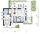 - parter (pow. użytkowa 79 m2): salon z jadalnią i wyjściem na taras (23,26 m2), pokój z wyjściem na taras (8,28 m2), otwarta kuchnia z meblami w zabudowie oraz sprzętem AGD (8,40 m2), spiżarnia (2,59 m2), łazienka z kabiną prysznicową, umywalką i toaletą (3,96 m2), garaż (18,90 m2), kotłownia (5,97 m2), wiatrołap (4,72 m2), hol (2,92 m2);