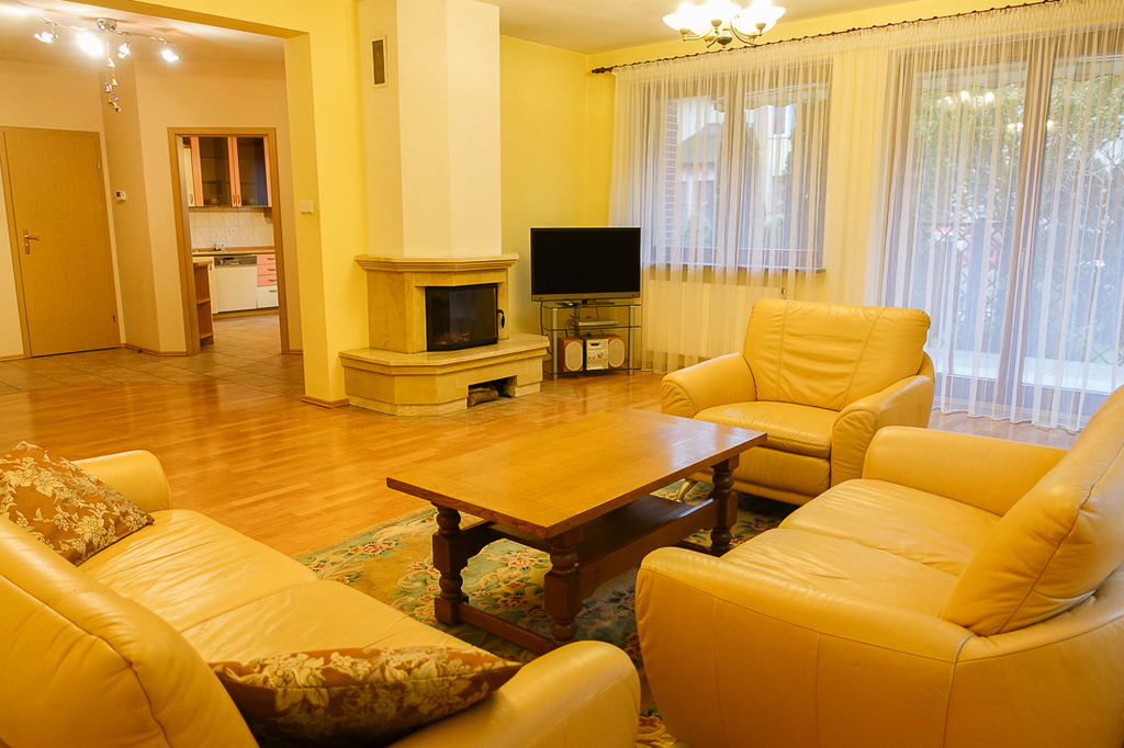 Do sprzedaży wolno stojący dom, z 2000 roku, bardzo wygodny i funkcjonalny. Kameralna lokalizacja na Gumieńcach, przy bardzo spokojnej ulicy, wśród bogatej zieleni i w otoczeniu innych domów jednorodzinnych oraz zielonych terenów rekreacyjnych. Okolice ulic Huzarów, Niepołomickiej, Tynieckiej.Dom z dobrym dostępem do komunikacji miejskiej. Idealny dla wielopokoleniowej rodziny.Wejście do budynku i wjazd do garażu z poziomu zerowego. Poddasze nieużytkowe, dom niepodpiwniczony.Powierzchnia użytkowa 189,5 m?, powierzchnia całkowita 250 m?.Dom położony na działce o powierzchni 492 m?.Parter (93,5 m?):* Hall (10,5 m?) - otwarty na salon, z wejściami do: kuchni, toalety dla gości, pomieszczeń technicznych oraz na poddasze.* Salon (32 m?) - z kominkiem i wyjściem podwójnymi drzwiami na taras (16 m?) i dalej do ogrodu z drzewami i krzewami. Salon otwarty na hall.* Kuchnia (13,5 m?) - o kształcie kwadratu, z oknem, zabudowa meblowa z urządzeniami AGD: lodówka, zmywarka 60 cm Whirpool, kuchenka elektryczna z płytą ceramiczną i piekarnikiem Amica, okap), stół z krzesłami.* Toaleta dla gości (2,6 m?) - WC z umywalką.Pomieszczenia techniczne:* Pralnia (10,5 m?) wanna i pralka, piec gazowy Buderus (wymieniony 3 lata temu) oraz zbiornik na ciepłą wodę (118 litrów)* Spiżarnia (5,2 m?) z dodatkową lodówką* Garaż (19,2 m?) na jeden samochód, brama uchylna sterowana pilotem.Wejście do domu przez wiatrołap (2,4 m?), na podłodze terakota.Piętro (88 m?):* Sypialnia 24,5 m? (po podłodze 27,3 m?)) z wejściem do garderoby* Garderoba 9 m? (po podłodze 11,5 m?) z oknem połaciowym* Pokój 16 m? (po podłodze 20,4 m?)* Pokój 9,5 m? (po podłodze 12,7 m?)* Hall wypoczynkowy 18,5 m? (po podłodze 20 m?) z oknem połaciowym*Łazienka o powierzchni 11,1 m? (po podłodze 13,5 m?) z wanną, umywalką, WC i bidetem, z możliwość zainstalowania kabiny prysznicowej, okno połaciowe.* Mała garderoba ze skosami bez okna.Na piętrze z sypialni i pokojach okna są pełnowymiarowe.Poddasze:Wejście z hallu opuszczanymi z góry schodami.Trzy pomieszczenia do przechowywania z oknami połaciowymi.Ocieplony dach oraz strop nad I piętrem ocieplony.Wysokość strychu w najwyższym punkcie 2,65 m.OPIS BUDYNKU:Powierzchnia użytkowa 189,5 m2 (po podłodze więcej), działka 492 m2.W otoczeniu domy jednorodzinne i szeregowe.Ogród z nasadzeniami ozdobnymi.Parter i piętro z niewielkimi skosami (wysoka ścianka kolankowa), poddasze nieużytkowe, niskie, bez podpiwniczenia.Budynek wybudowany z bloczków, dach stromy z blachodachówką. Ściany kolankowe na I piętrze o wysokości 1,3 m.W łazience, i toaletach glazura i terakota.W pomieszczeniach technicznych terakota.Okna nowoczesne drewniane VELUX, dwuszybowe, na piętrze częściowo połaciowe, parapety drewniane.Ogrzewanie gazowe, drzwi wejściowe antywłamaniowe, rolety antywłamaniowe na całym parterze sterowane pilotem, alarm, monitoring.Garaż wbudowany, z miejscem na 1 samochód i jednoślady. Drzwi do garażu uchylne sterowane pilotem.Działka ogrodzona z bramą sterowaną pilotem.Możliwość pozostawienia mebli lub ich wyniesienia.or sale: a detached house, built in 2000, very comfortable and functional. In a cozy location in Gumieńce, on a very quiet street, surrounded by lush greenery and other single-family homes and green recreational areas. Located near Huzarów, Niepołomicka, and Tyniecka streets, the house offers good access to public transportation. Ideal for a multi-generational family. The entrance to the building and the garage are ground-level. The attic is unusable, and the house does not have a basement. Usable area: 189.5 m?, total area: 250 m?. The house sits on a 492 m? plot. Ground floor (93.5 m?): * Hall (10.5 m?) - open to the living room, with entrances to the kitchen, guest toilet, technical rooms, and the attic. * Living room (32 m?) - with a fireplace and double doors leading to the terrace (16 m?) and beyond to the garden with trees and shrubs. Living room open to the hall. * Kitchen (13.5 m?) - square-shaped, with a window, built-in furniture with appliances: refrigerator, 60 cm Whirlpool dishwasher, electric stove with ceramic hob and Amica oven, hood), table and chairs. * Guest toilet (2.6 m?) - toilet with sink. Technical rooms: * Laundry room (10.5 m?) with bathtub and washing machine, Buderus gas boiler (replaced 3 years ago) and hot water tank (118 liters) * Pantry (5.2 m?) with additional refrigerator * Garage (19.2 m?) for one car, remote-controlled up and over gate. Entrance to the house is through the vestibule (2.4 m?), with terracotta floors. First floor (88 m?): * Bedroom 24.5 m? (27.3 m? floor area)) with entrance to the wardrobe * Wardrobe 9 m? (11.5 m? floor area) with roof window * Room 16 m? (20.4 m? floor area) * Room 9.5 m? (12.7 m? floor area) * Lounge 18.5 m? (20 m? floor area) with roof window * Bathroom 11.1 m? (13.5 m? floor area) with bathtub, washbasin, toilet and bidet, with the possibility of installing a shower cabin, roof window. * Small wardrobe with sloping ceilings without window. There are full-size windows in the bedrooms and rooms on the first floor. Attic: Access from the hall via retractable stairs. Three storage rooms with skylights. Insulated roof and insulated ceiling above the first floor. Attic height at its highest point is 2.65 m. BUILDING DESCRIPTION: Usable area: 189.5 m? (more on the floor), plot: 492 m?. Surrounded by single-family and terraced houses. Garden with ornamental plantings. Ground and first floors with slight slopes (high knee wall), unused, low-ceilinged attic, no basement. The building is constructed of concrete blocks, with a steep roof and metal tiles. Knee walls on the first floor are 1.3 m high. Tiles and terracotta are in the bathroom and toilets. Terracotta is in the technical rooms. Modern wooden VELUX double-glazed windows, partially roof-hung on the first floor, and wooden window sills. Gas heating, burglar-proof entrance 