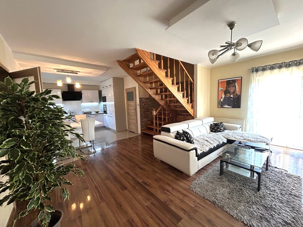 Dom w zabudowie bliźniaczej, wybudowany w 2009 roku na działce o powierzchni 377 m2, położnej w dzielnicy Bukowo.Dobry dojazd, ciche, zielone miejsce to nie jedyne atuty tej nieruchomości.Na powierzchnię domu (całkowita z garażem - 147,5 m2) składają się dwa poziomy:PARTER (pow. 63,6 m2)- wiatrołap- pokój dzienny (kominek) z którego jest wyjście do ogródka,- w pełni wyposażony w sprzęt AGD i umeblowany aneks kuchenny z miejscem do spożywania posiłków,- pokój gościnny, który może również pełnić funkcję gabinetu- łazienka z wanną i toaletą, ogrzewanie podłogowePIĘTRO (pow. 46 m2)- trzy sypialnieW bryle budynku znajduje się garaż (pow. 37,9 m2); brama do garażu oraz brama wjazdowa na posesję otwierane automatycznie.Dom nie jest podpiwniczony. Ściany zewnętrzne murowane z cegły Porttherm 25, ocieplone styropianem 12 cm; Dach docieplony wełną mineralną. Okna PCV i połaciowe. Podłoga panele i terakota. Ogrzewanie piec gazowy 2 funkcyjny z zamkniętą komorą spalania. Klimatyzacja, instalacja alarmowa, kominek...., na działce tuje, świerki, brzoza.Jeżeli ktoś szuka niedużego kameralnego domu z "kawałkiem ziemi" to ten dom powinien koniecznie zobaczyć, może okazać się strzałem w dziesiątkę.*powyższe informacje zostały sporządzone na podstawie oświadczeń i nie są ofertą w rozumieniu przepisów prawa - zalecamy ich osobistą weryfikację.