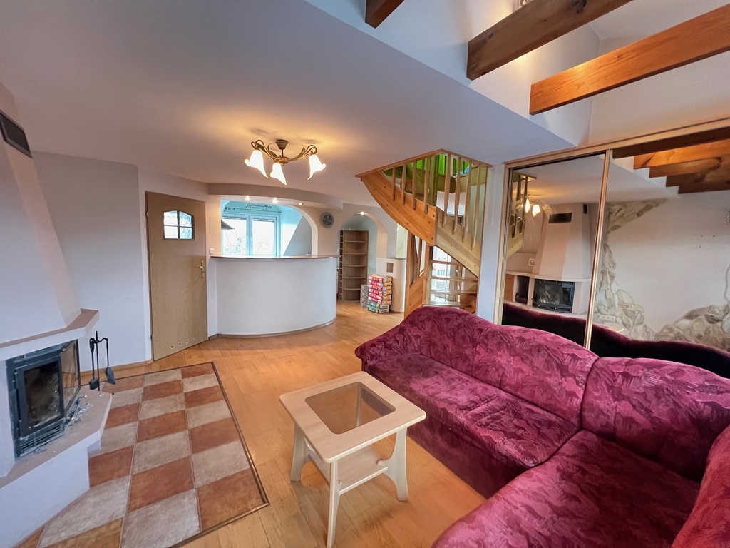 • Poddasze użytkowe: 2 pokoje, kuchnia, łazienka, kominek z płaszczem wodnym, dodatkowy pokój na zaadaptowanym strychu