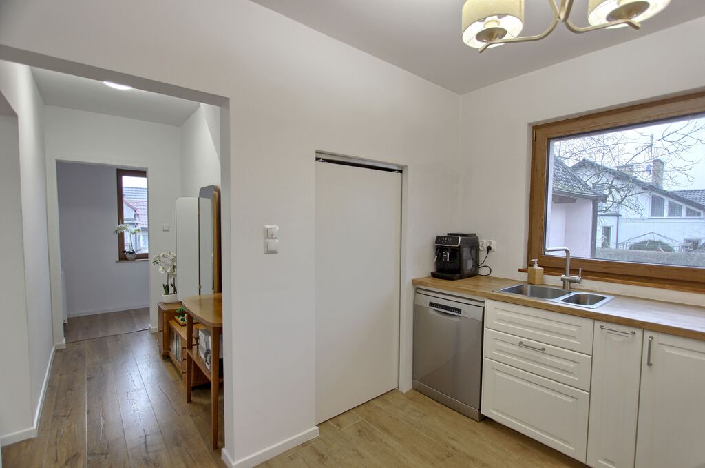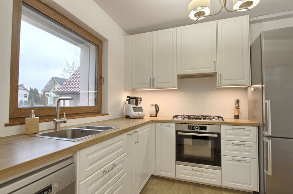 - kuchnia z osobną spiżarnią - meble w zabudowie, sprzęty: piekarnik z mikrofalówką, kuchenka gazowa, okap, zmywarka, lodówka