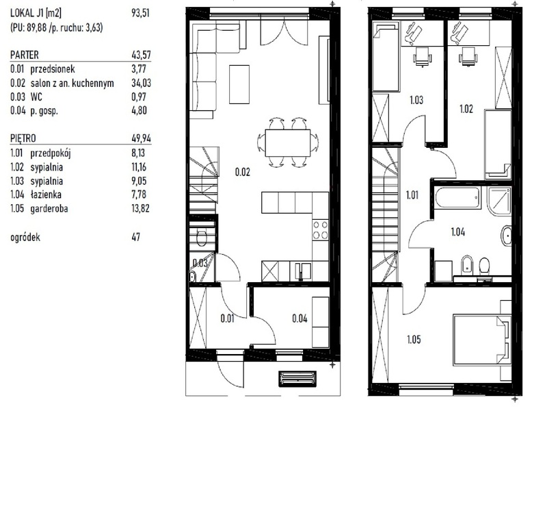 Na parterze znajduje się przedsionek (3,77m2), pomieszczenie gospodarcze (4,80m2), oddzielne WC (0,97m2), oraz przestronna strefa dzienna, na którą składa się salon z aneksem kuchennym (34,03m2) i wyjściem do ogródka (47m2).