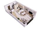 Na parterze znajduje się przedsionek (3,04m2), pomieszczenie gospodarcze (3,34m2), oddzielne WC (0,97m2), oraz przestronna strefa dzienna, na którą składa się salon z aneksem kuchennym (30,21m2) i wyjściem do ogródka (83m2).