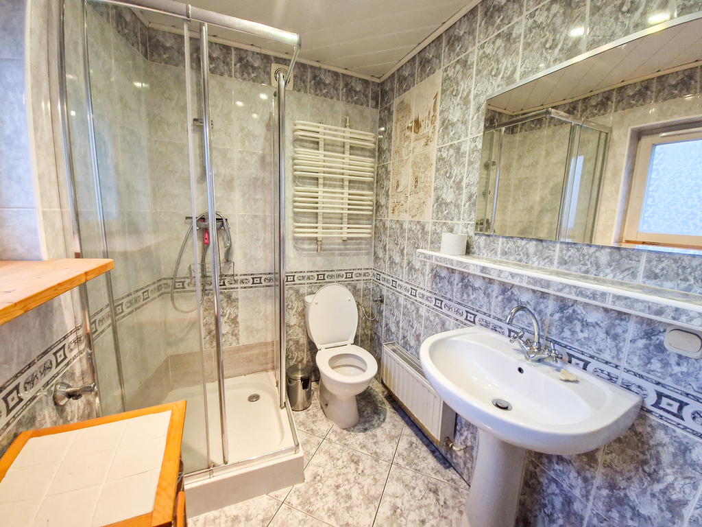 - Parter: salon, gabinet, oddzielna kuchnia, łazienka z prysznicem