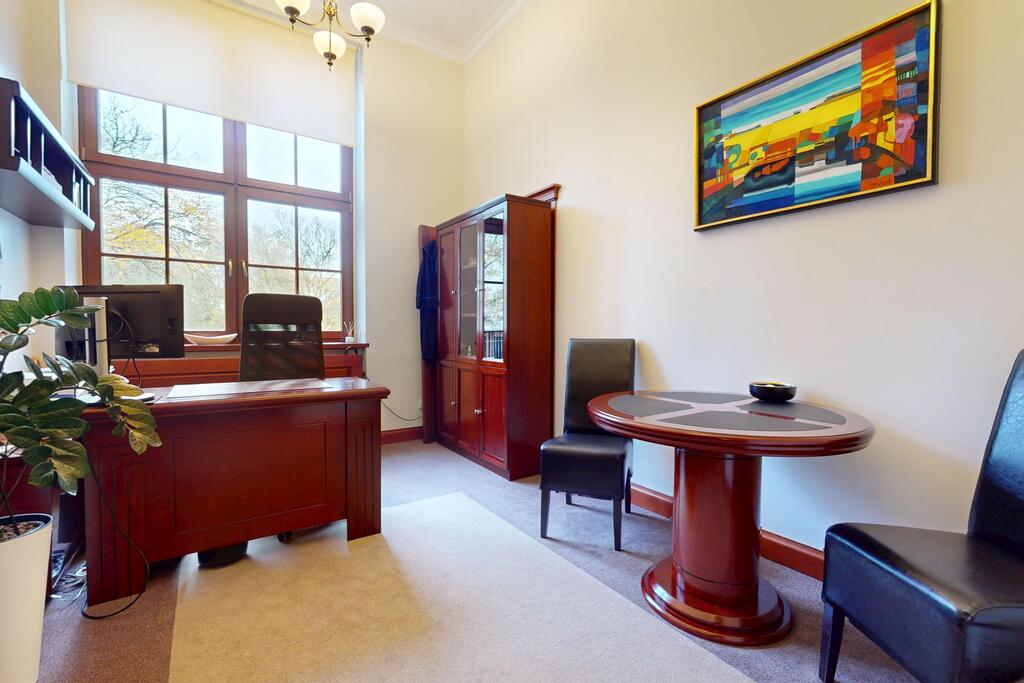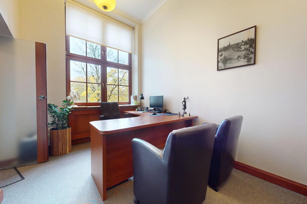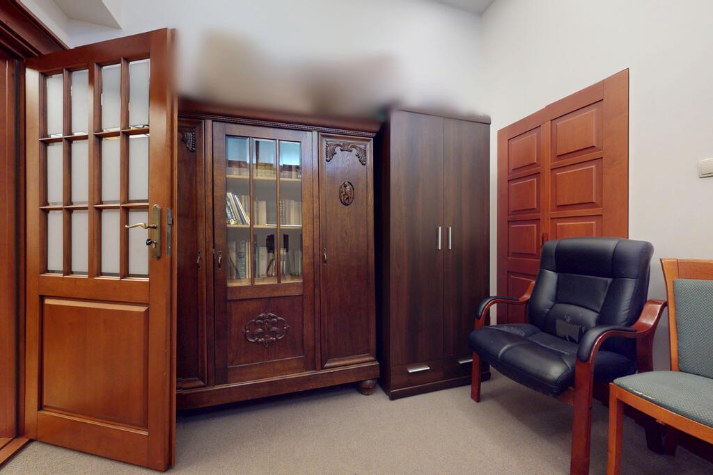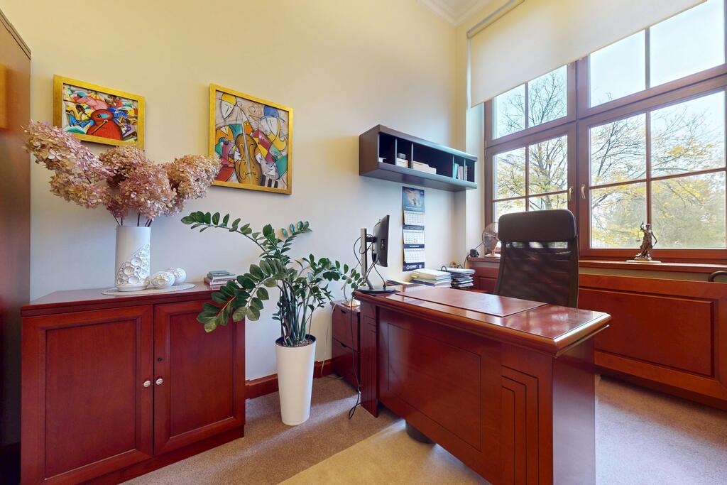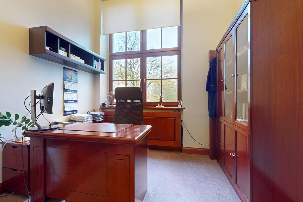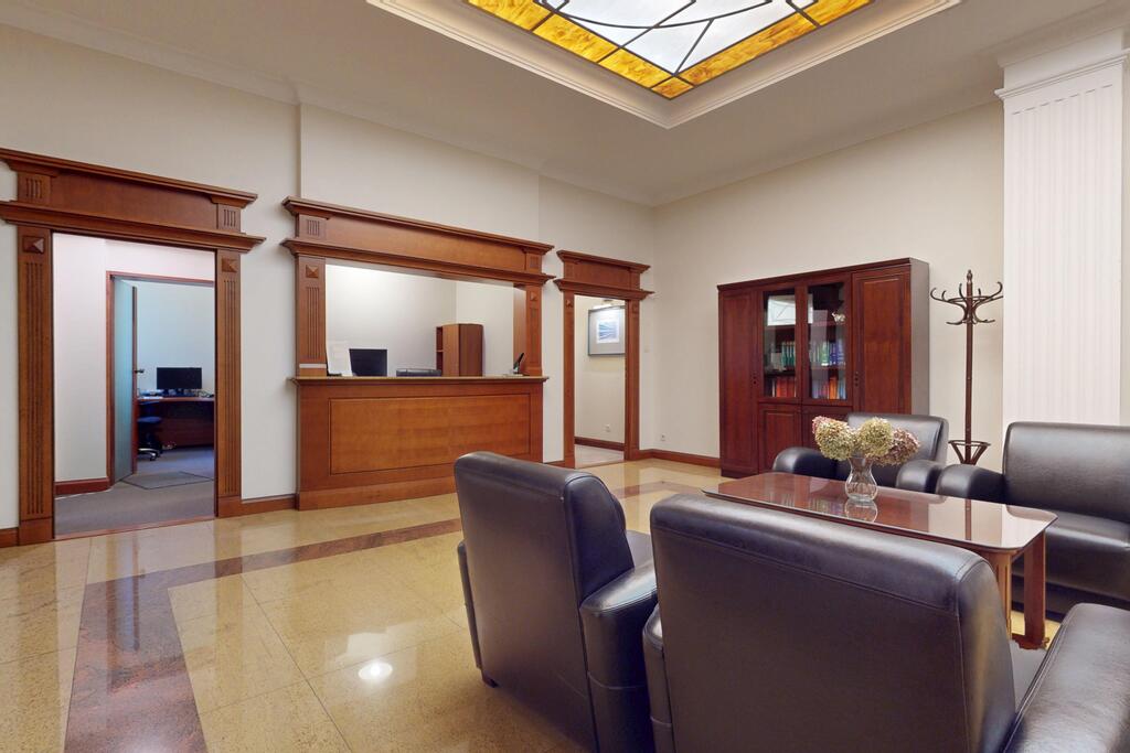 Pierwsza część o powierzchni 240 m? jest kompletnie wykończona w bardzo wysokim standardzie, z wnętrzami utrzymanymi w stylowym, eleganckim charakterze. W jej skład wchodzi przestronny i reprezentacyjny hol, który stanowi doskonałe pierwsze wrażenie dla klientów oraz wizytówkę lokalu. Dalej znajduje się pięć okazałych, reprezentacyjnych gabinetów, zaprojektowanych z dbałością o detale i komfort pracy. Wydzielono również część socjalną, obejmującą toaletę oraz w pełni wyposażoną kuchnię, co zapewnia wygodę codziennego użytkowania. Ta część lokalu jest gotowa do natychmiastowego wprowadzenia i doskonale nadaje się na kancelarię notarialną, adwokacką, biuro doradcze, gabinety lekarskie lub prestiżową siedzibę firmy.