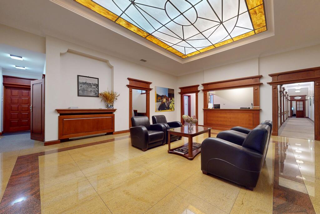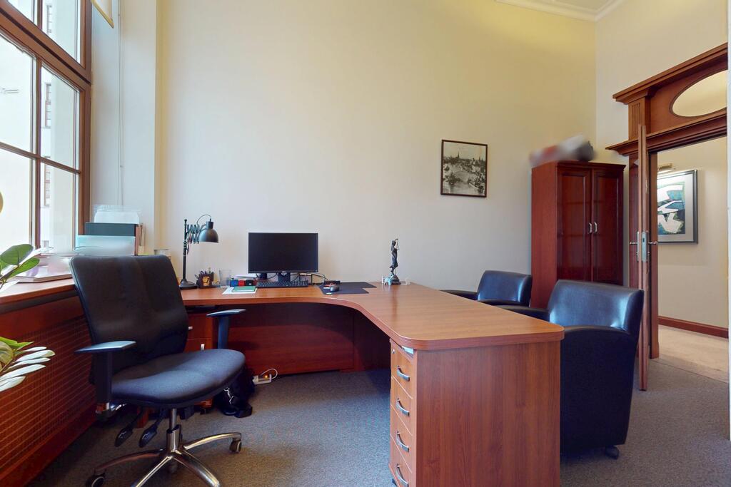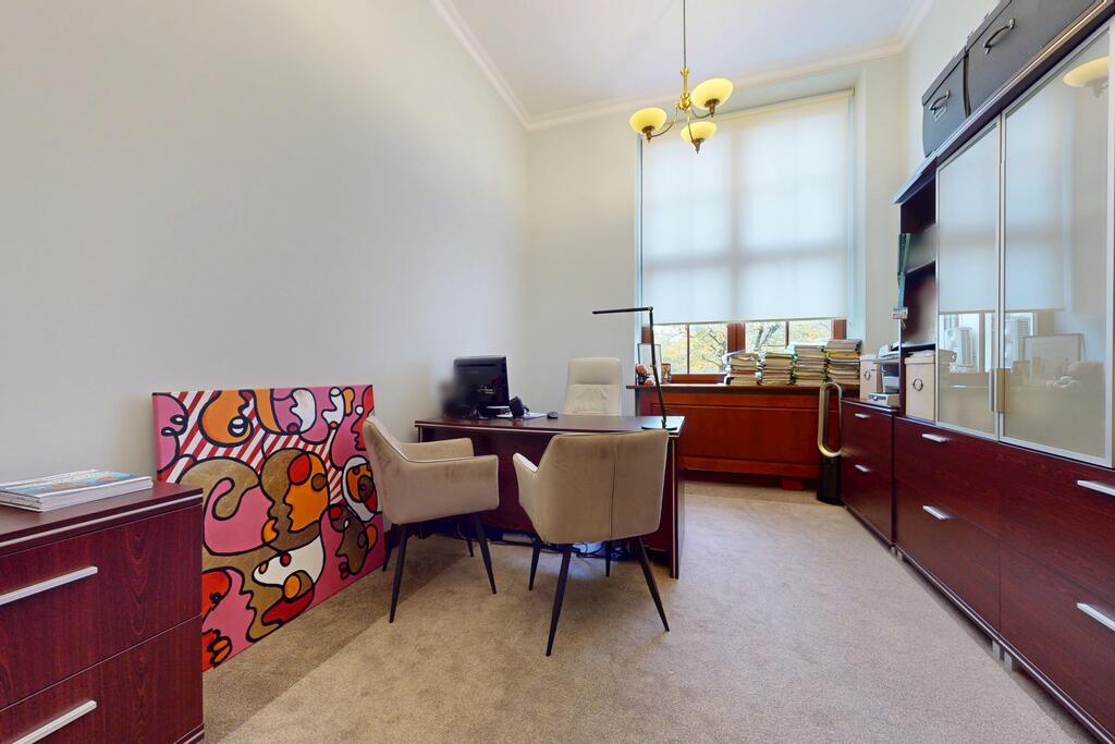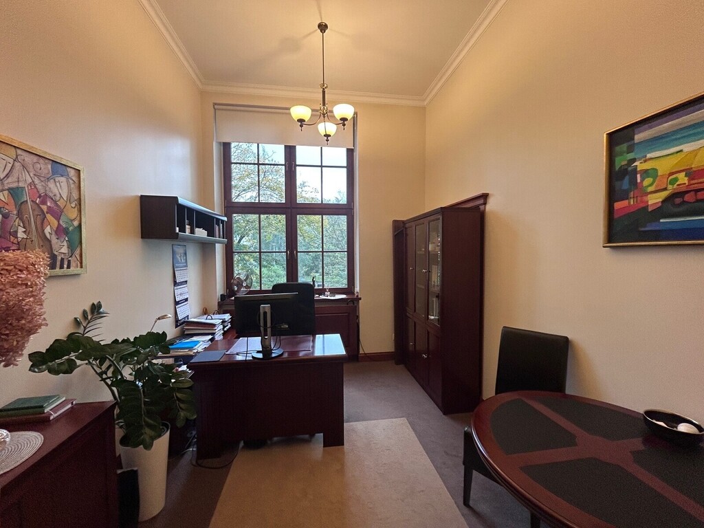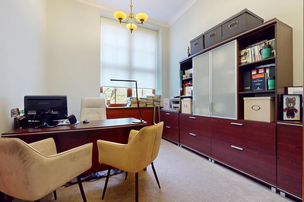 Pierwsza część o powierzchni 240 m? jest kompletnie wykończona w bardzo wysokim standardzie, z wnętrzami utrzymanymi w stylowym, eleganckim charakterze. W jej skład wchodzi przestronny i reprezentacyjny hol, który stanowi doskonałe pierwsze wrażenie dla klientów oraz wizytówkę lokalu. Dalej znajduje się pięć okazałych, reprezentacyjnych gabinetów, zaprojektowanych z dbałością o detale i komfort pracy. Wydzielono również część socjalną, obejmującą toaletę oraz w pełni wyposażoną kuchnię, co zapewnia wygodę codziennego użytkowania. Ta część lokalu jest gotowa do natychmiastowego wprowadzenia i doskonale nadaje się na kancelarię notarialną, adwokacką, biuro doradcze, gabinety lekarskie lub prestiżową siedzibę firmy.