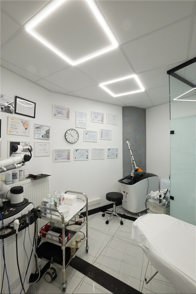 - Gabinet zabiegów iniekcyjnych z elektrycznym fotelem kosmetycznym i profesjonalnym oświetleniem (botoks, mezoterapia, wypełniacze).