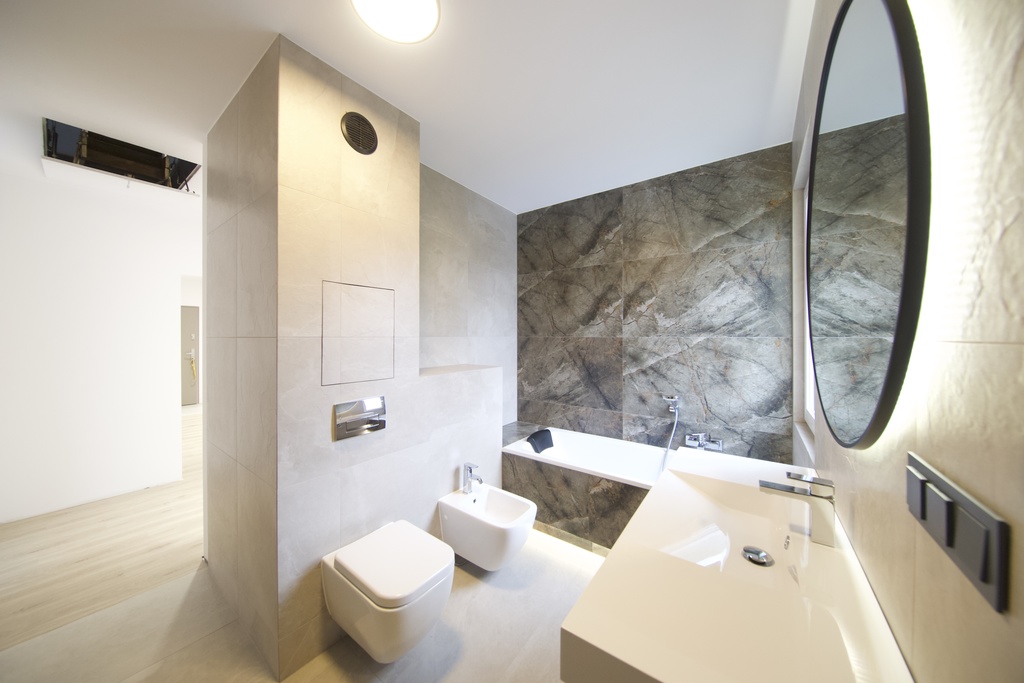 Przewidziano optymalną ilość punktów świetlnych na sufitach i ścianach dających dobre i eleganckie oświetlenie. Zdemontowano wszystkie podłogi, wykonano wylewkę samopoziomującą i ułożono nowe nawierzchnie: ? Szkliwiony hiszpański gres Geotiles MAKAI MARFIL white, 60x120 gat. I, faktura ? łupek ? Panele Berry Alloc Ocean+ 8mm, kolor Bloom Natural+ na macie kwarcowej. Łazienka ? bardzo widna, z oknem. Przy kąpieli widok na niebo. Ściany i podłoga w gresie identycznym jak w reszcie mieszkania, poza ciemniejszym akcentem na ścianie przy wannie. Wanna Kaldewei Cayono 170cm. Armatura biała (bidet, wc i umywalka): BERNSTEIN. Pozostałe: GEBERIT, HANSGROHE. Podświetlenie LED wanny i bezdotykowe podświetlenie LED lustra fi 100cm nad umywalką.
