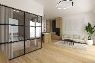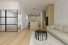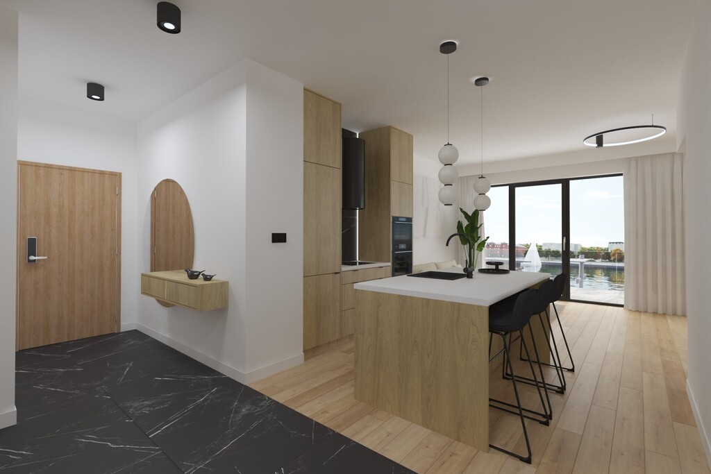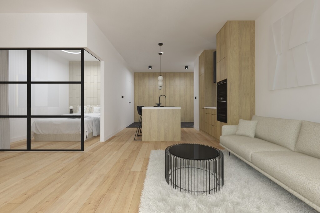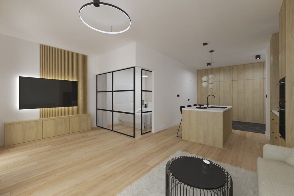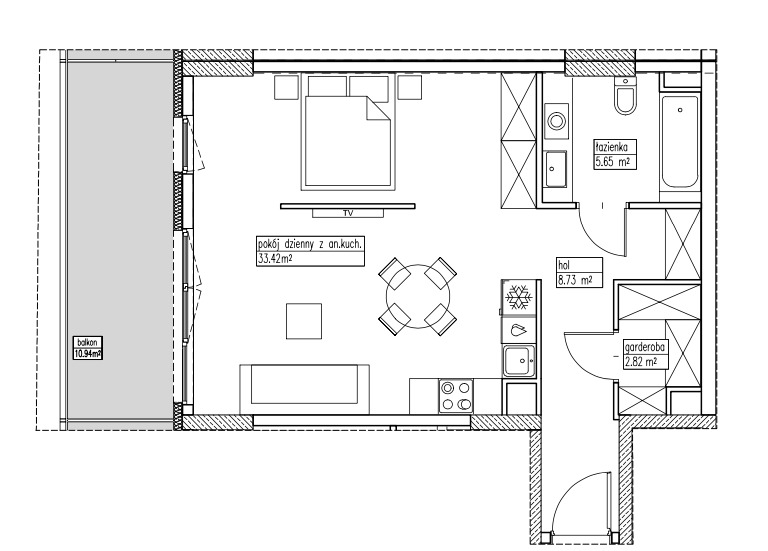 Apartament o powierzchni 48,65, składa się z salonu z aneksem kuchennym, wydzielonej sypialni, łazienki, garderoby i holu.