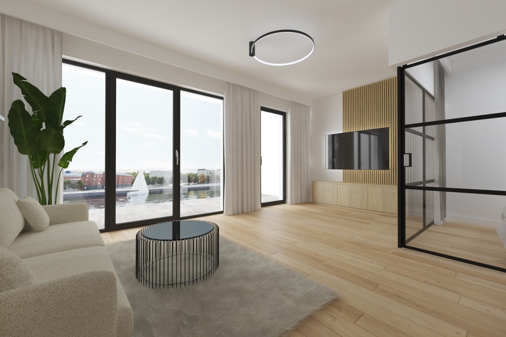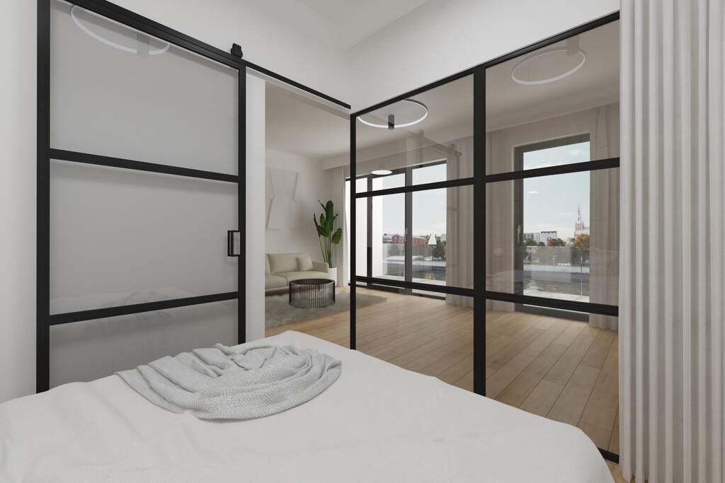 Mieszkanie posiada duży balkon od strony rzeki z widokiem na wodę i miasto.