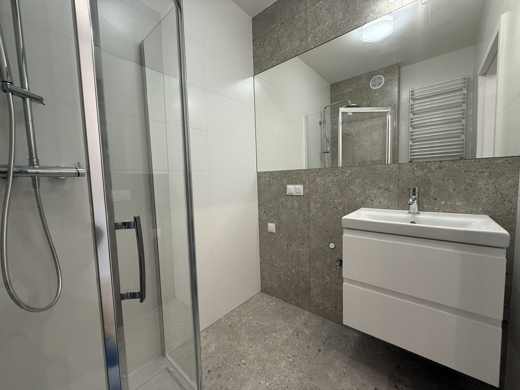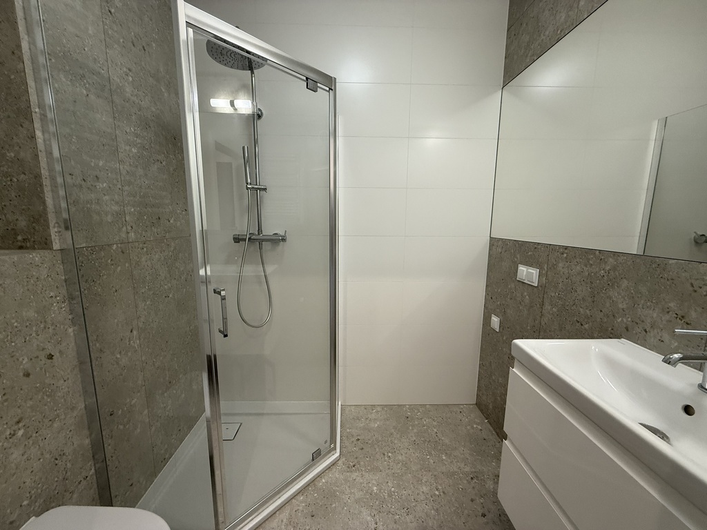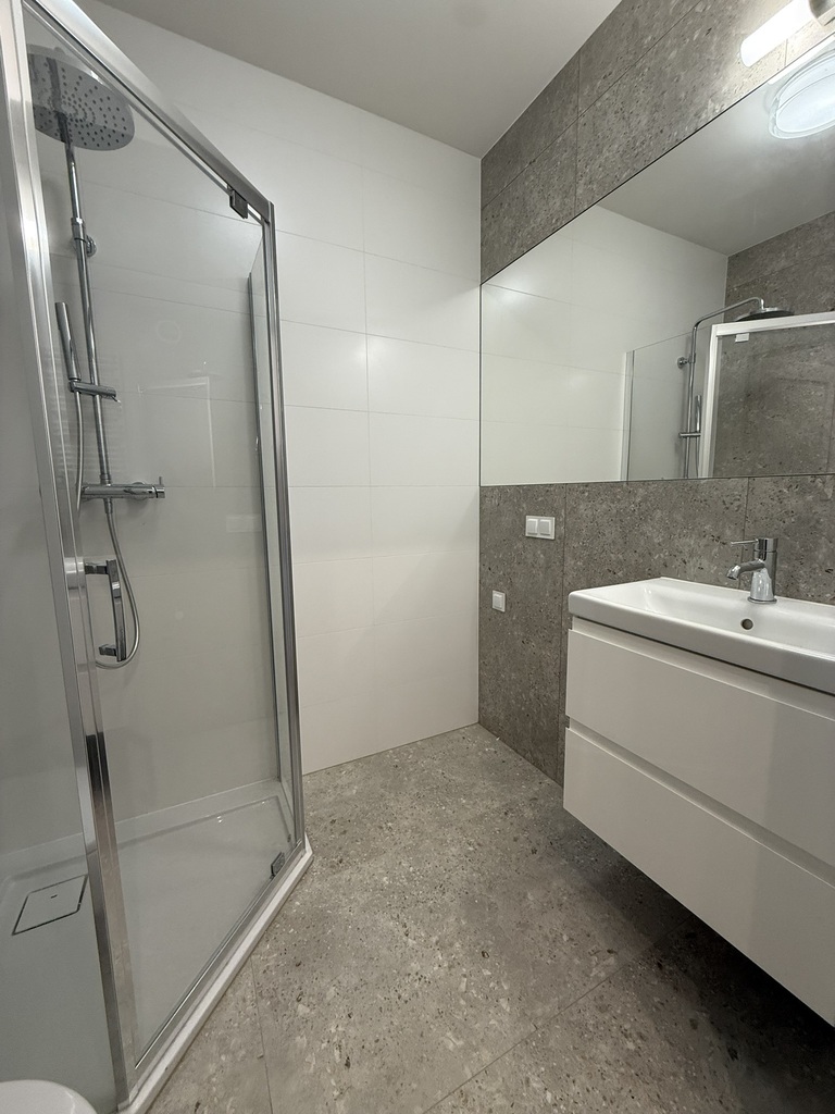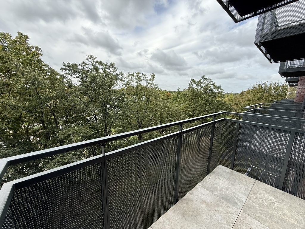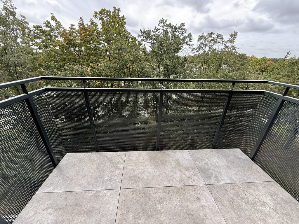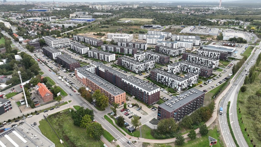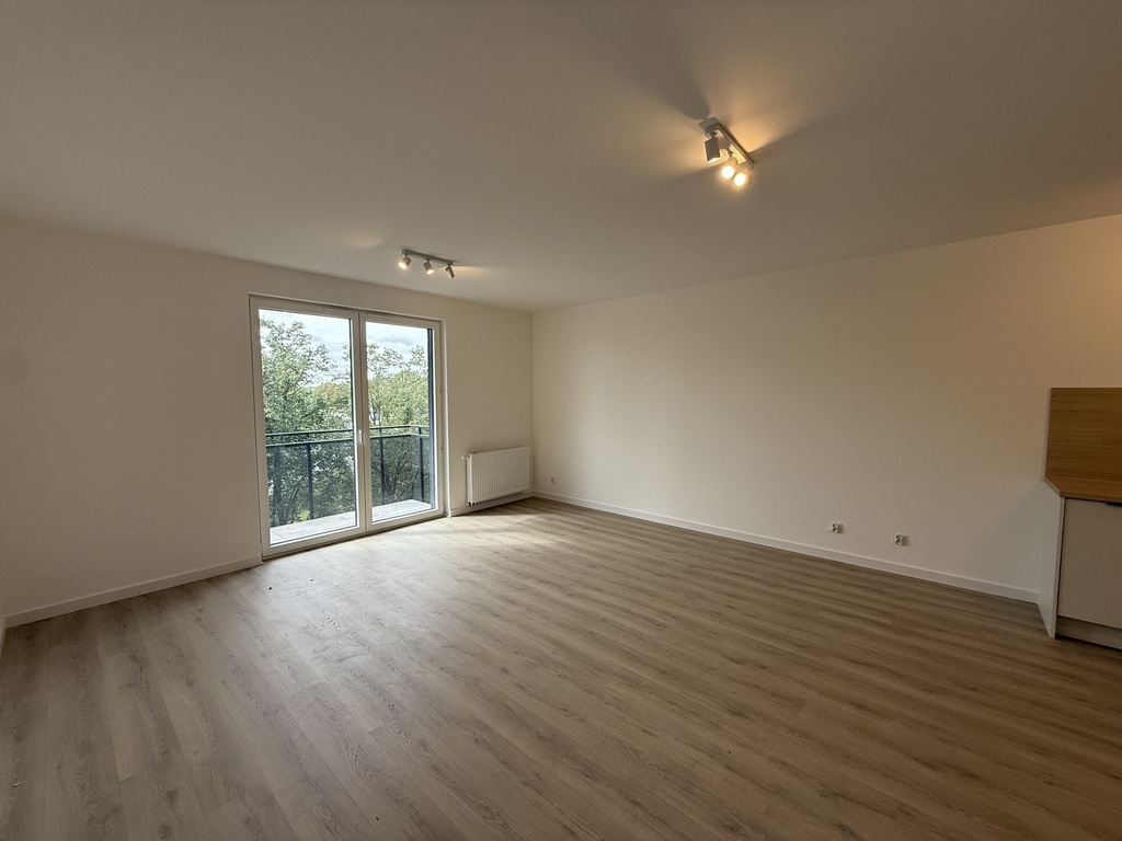 - Układ: przestronny salon z aneksem kuchennym, łazienka z prysznicem, balkon z widokiem na zieleń