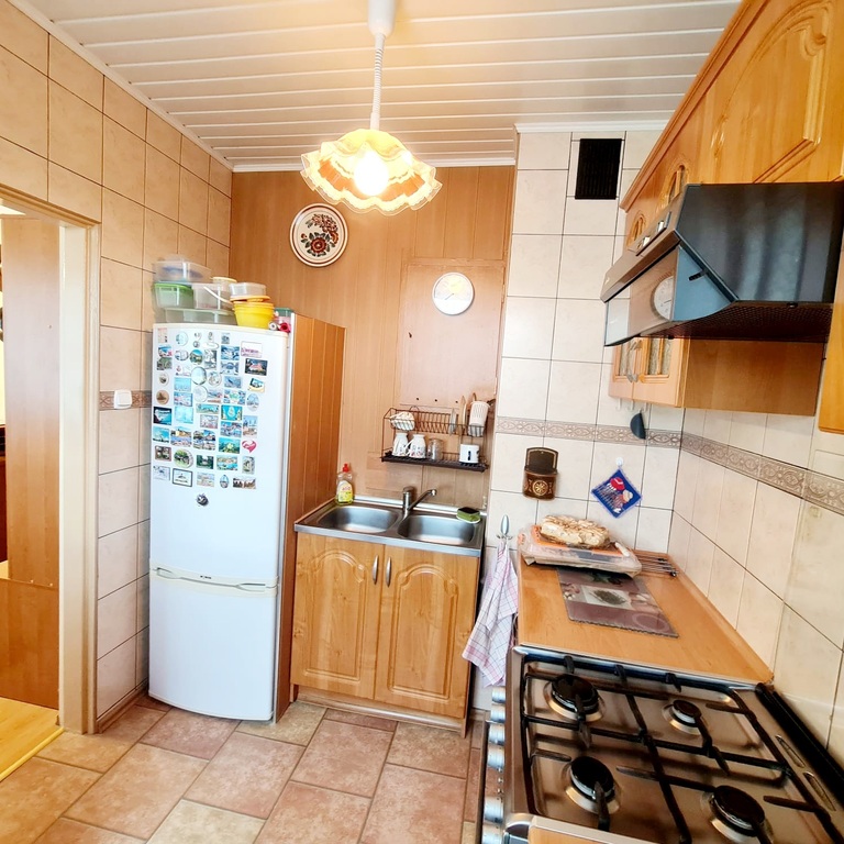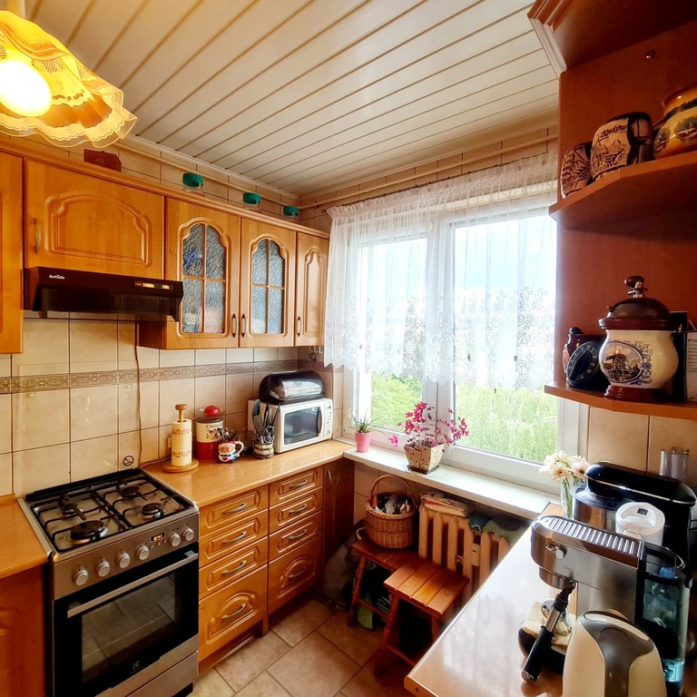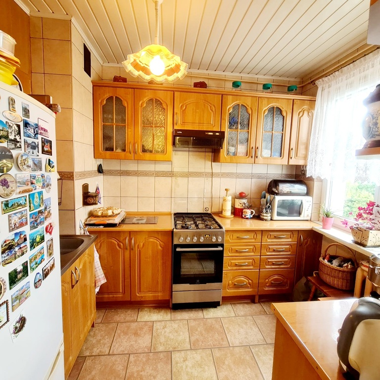 - Kuchnia: oddzielna całkowicie zabudowana szafkami dębowymi , sprzęty AGD , na podłodze terakota.