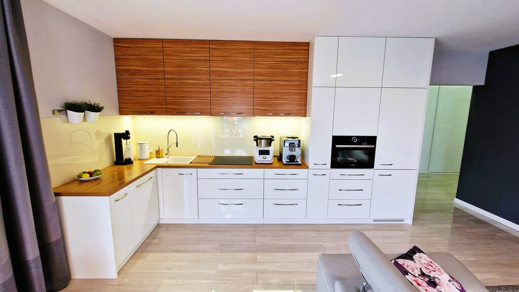 Dodatkowo duży balkon z markizą, z widokiem na ogrody i tereny zielone.
