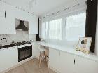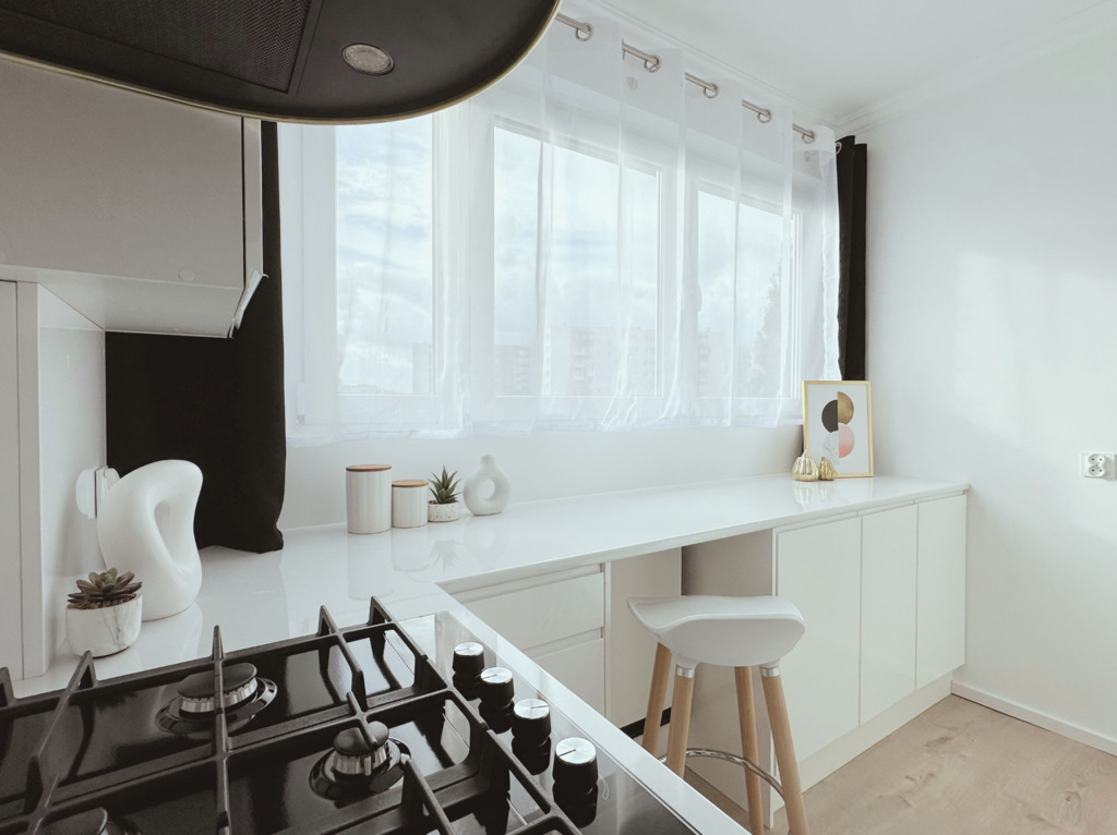 - Osobnej, jasnej kuchni z pełną zabudową i nowoczesnym sprzętem AGD (płyta gazowa i piekarnik Samsung, zmywarka Ariston, pralka),