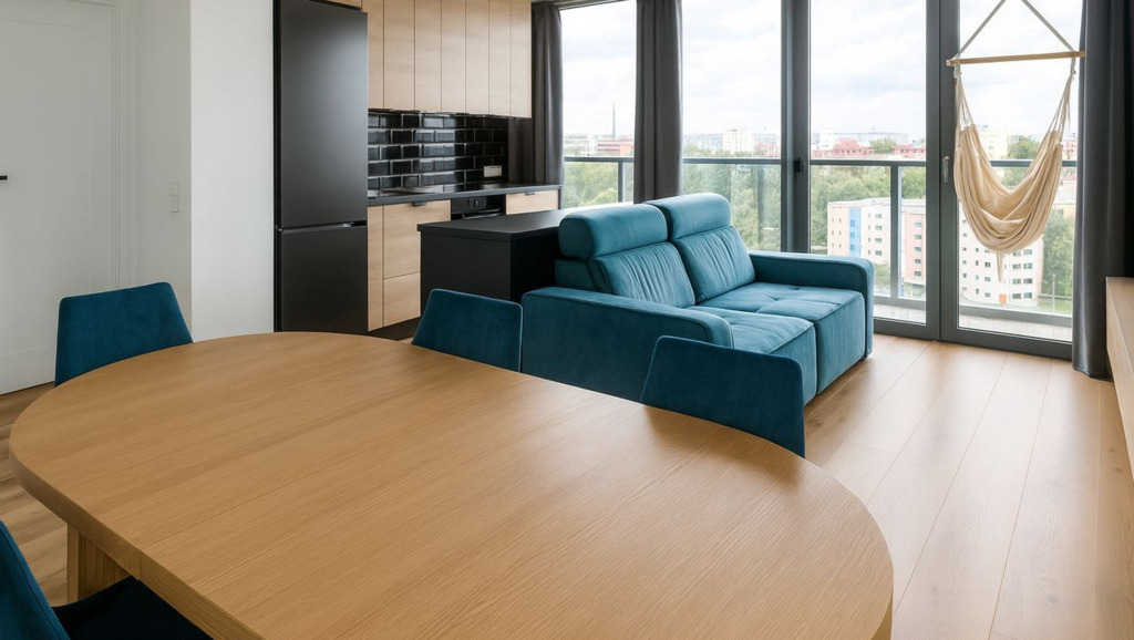 Na balkon można wejść zarówno z salonu jak i z sypialni co dodatkowo otwiera przestrzeń mieszkania.