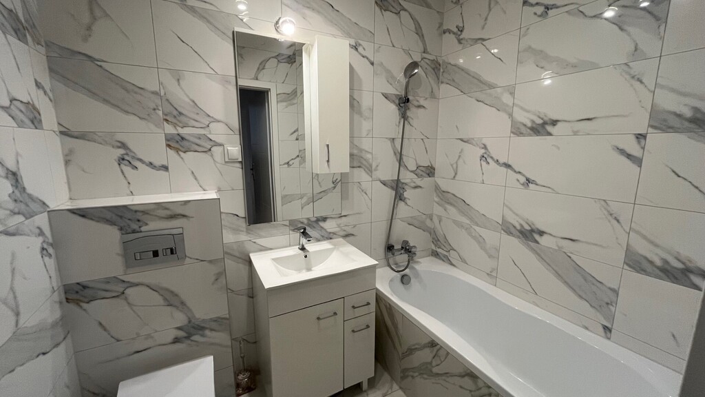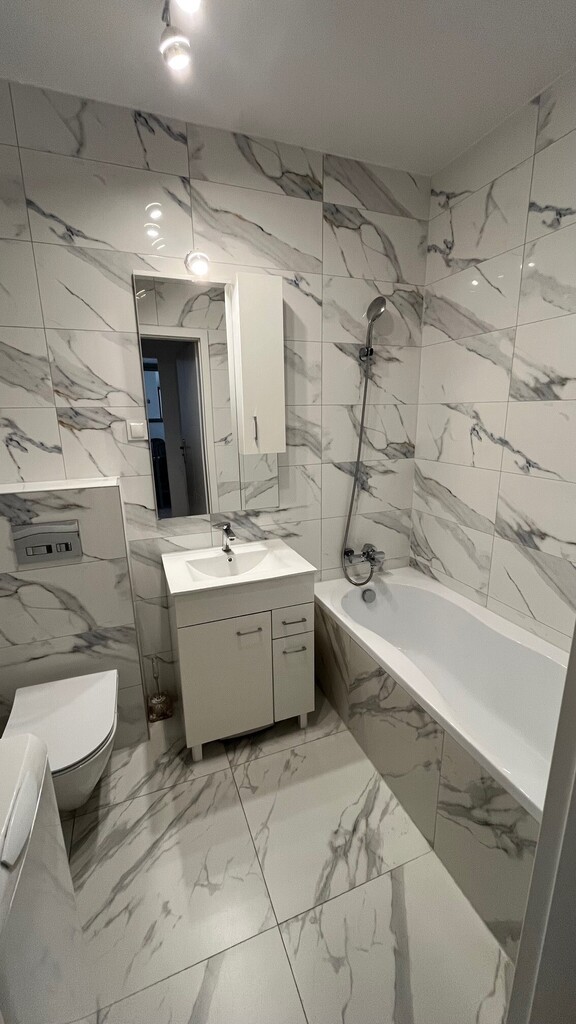 Na podłodze panele oraz kafle, ściany gładzone malowane.