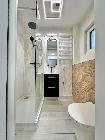 Kuchnia z meblami w zabudowie, Łazienka wyposażona w kabinę prysznicową.