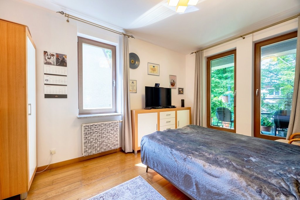Mieszkanie, w którym każdy detal został dopracowany, by zapewnić najwyższy komfort codziennego życia. Duże, panoramiczne okna pozwalają cieszyć się widokiem na zieleń i dają poczucie przestronności. Dzięki wysokim sufitom (2,90 m), wnętrza wydają się jeszcze bardziej przestronne, co dodatkowo podkreśla elegancki charakter tego apartamentu.