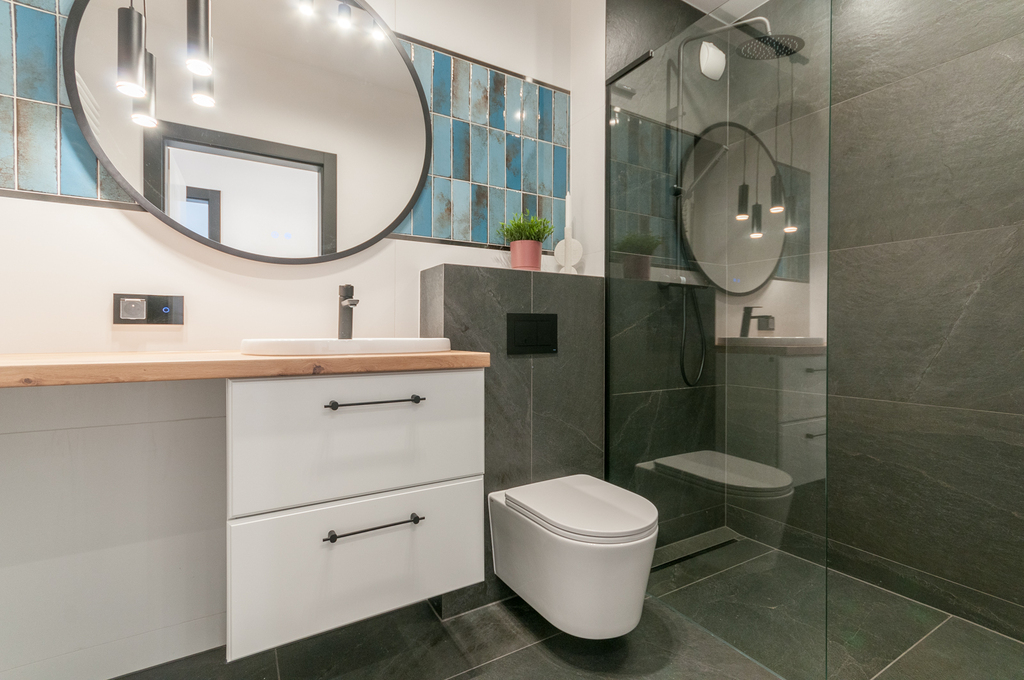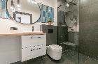 * łazienka wykończona w kaflach, z kabina prysznicową typu walk-in; zabudowany geberit, szafka z umywalką,