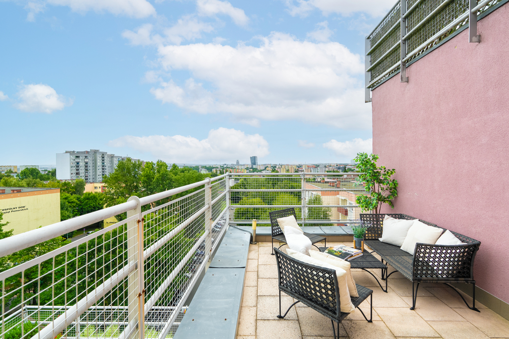 Największym atutem jest duży taras o powierzchni 16 m?, z którego rozpościera się widok na panoramę Szczecina. To idealne miejsce na poranną kawę, popołudniowy relaks czy spotkania z bliskimi.