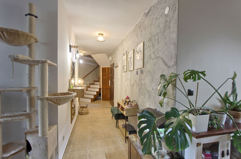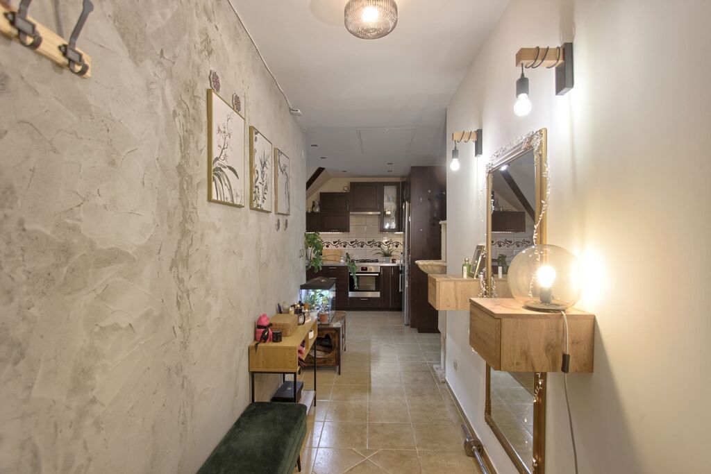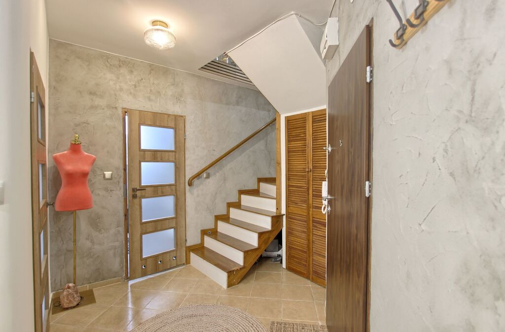 Ściany wygładzone i pomalowane, na podłodze w części mieszkalnej parkiet, w kuchni i łazience terakota.