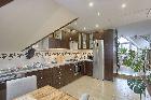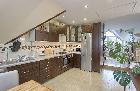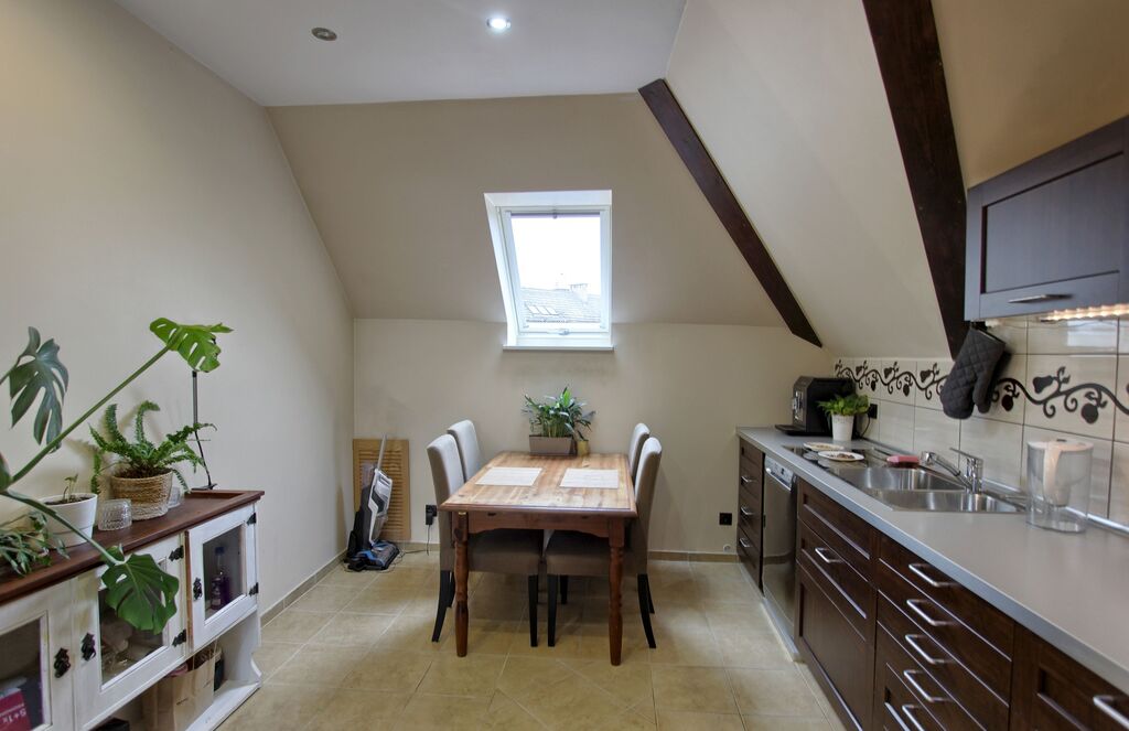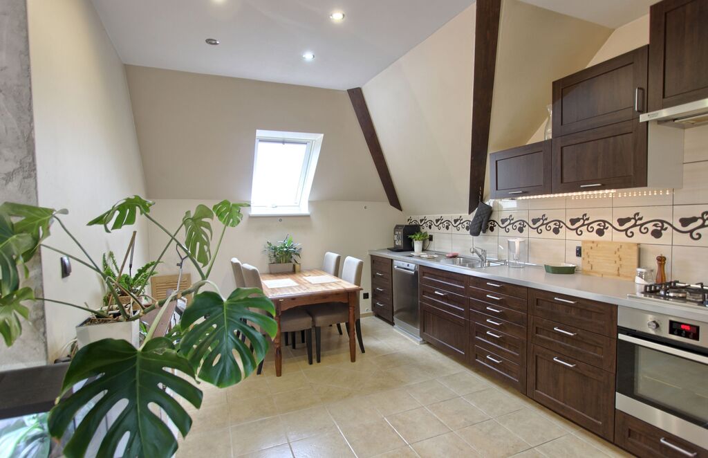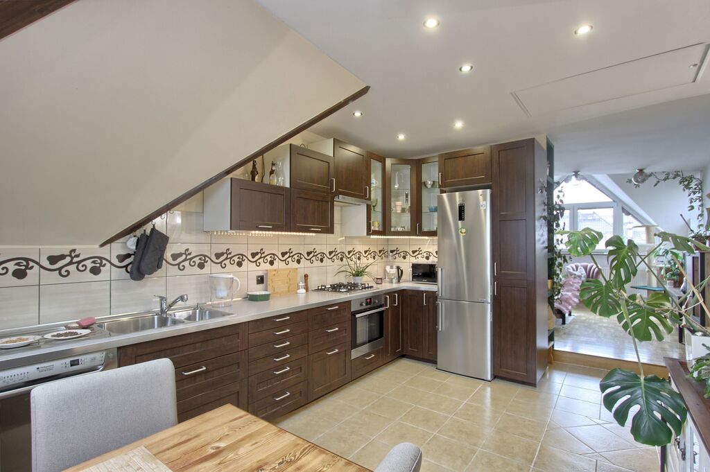 Kuchnia zabudowana meblami na wymiar wyposażona jest w sprzęt AGD: lodówkę z zamrażarką, zmywarkę, kuchenkę gazową, piekarnik.