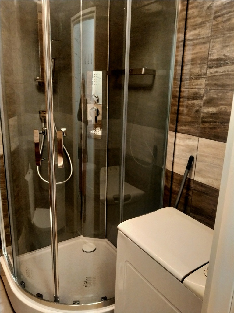 • elegancka łazienka z kabiną prysznicową, wc,( pralka).